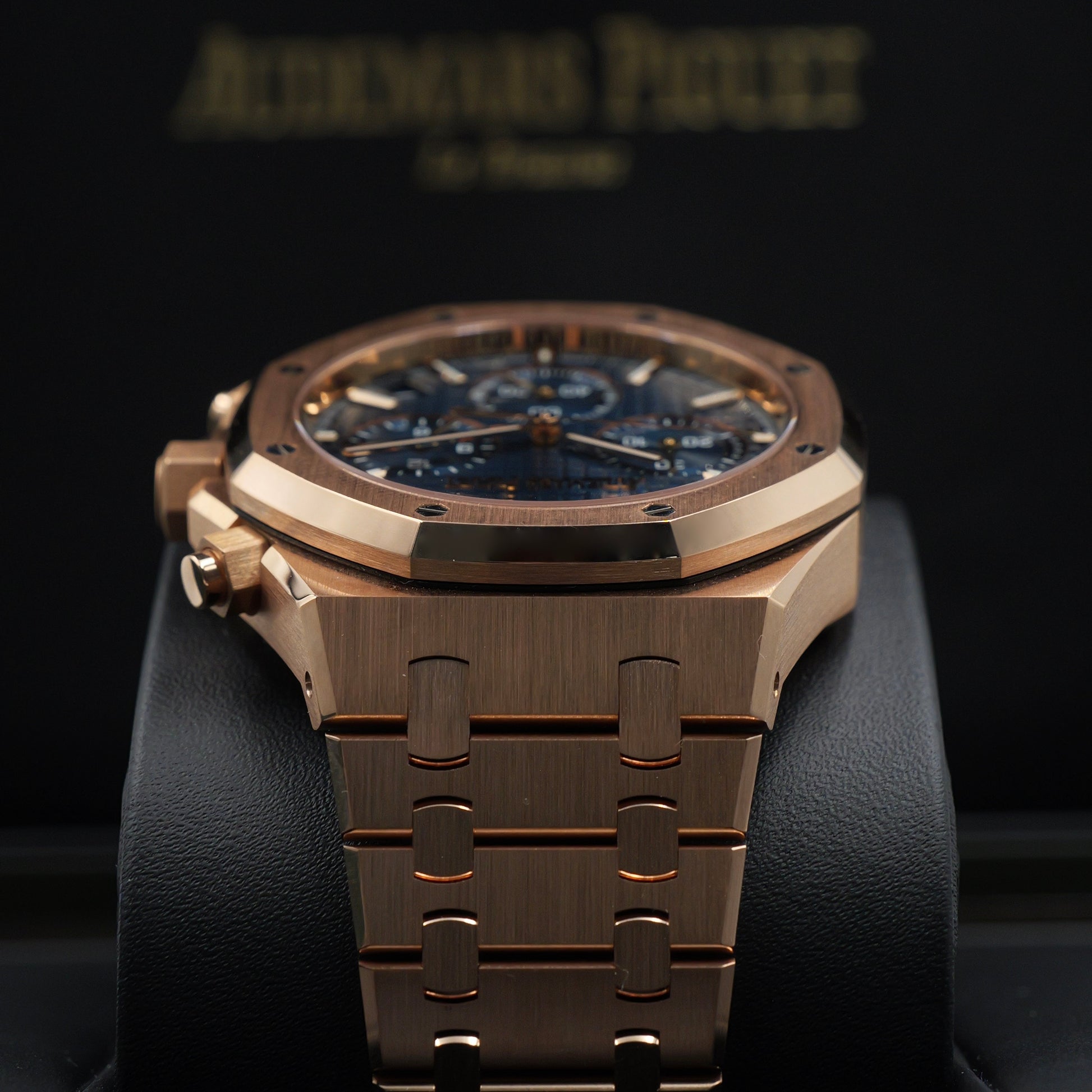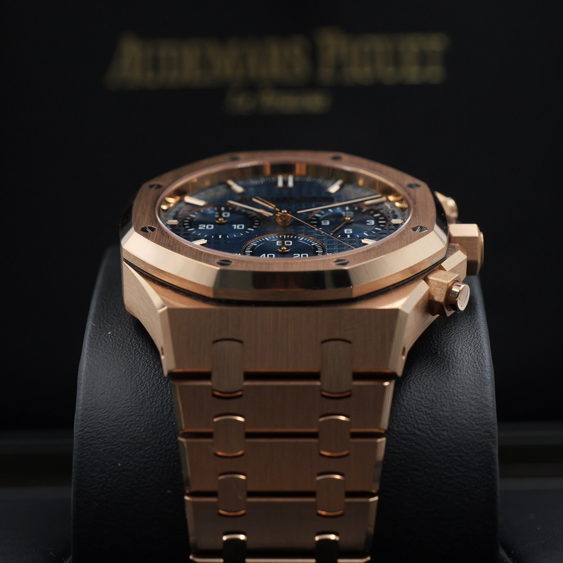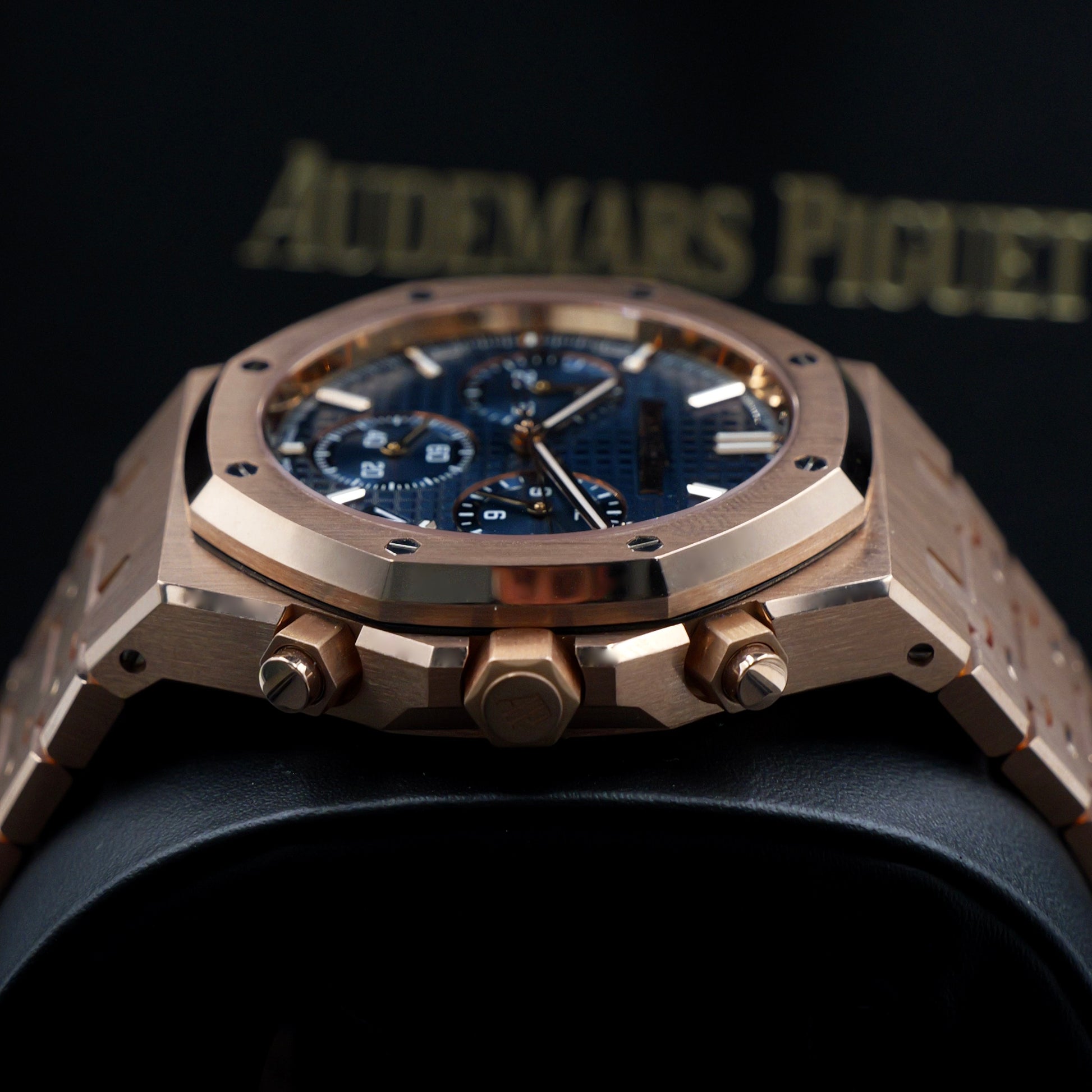 The Audemars Piguet Royal Oak Chronograph reference 26240OR.OO.1320OR.01 represents the perfect fusion of power, elegance, and craftsmanship. Crafted entirely in 18ct rose gold and paired with a striking blue “Grande Tapisserie” dial, this model redefines the modern chronograph with the timeless sophistication of the Royal Oak design.