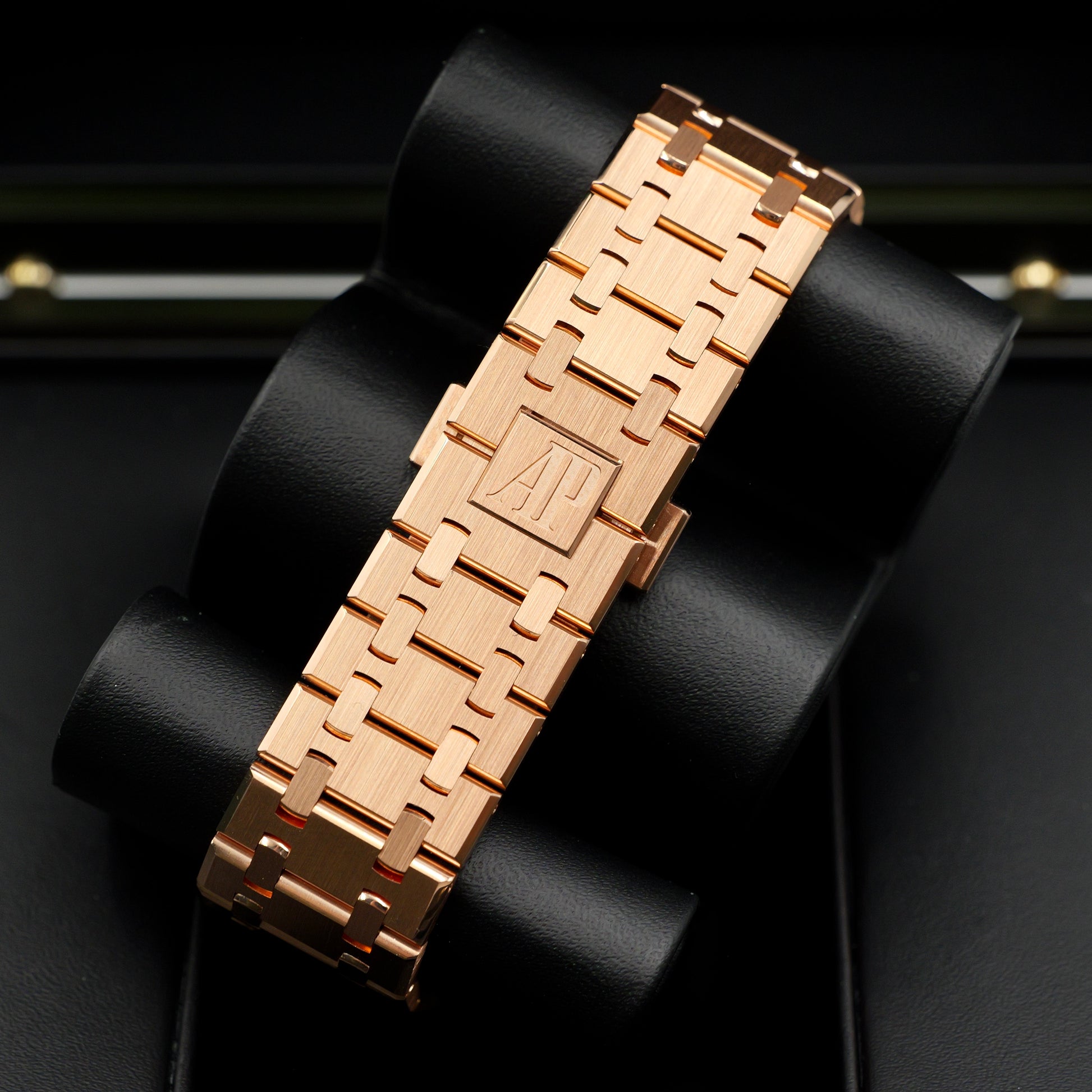 The 41 mm octagonal case, instantly recognisable by Gérald Genta’s legendary design, displays AP’s signature interplay of satin-brushed and polished finishes. The integrated 18ct rose gold bracelet, finished to perfection, provides a seamless flow from case to wrist and is secured with a folding AP clasp for ultimate comfort and luxury.