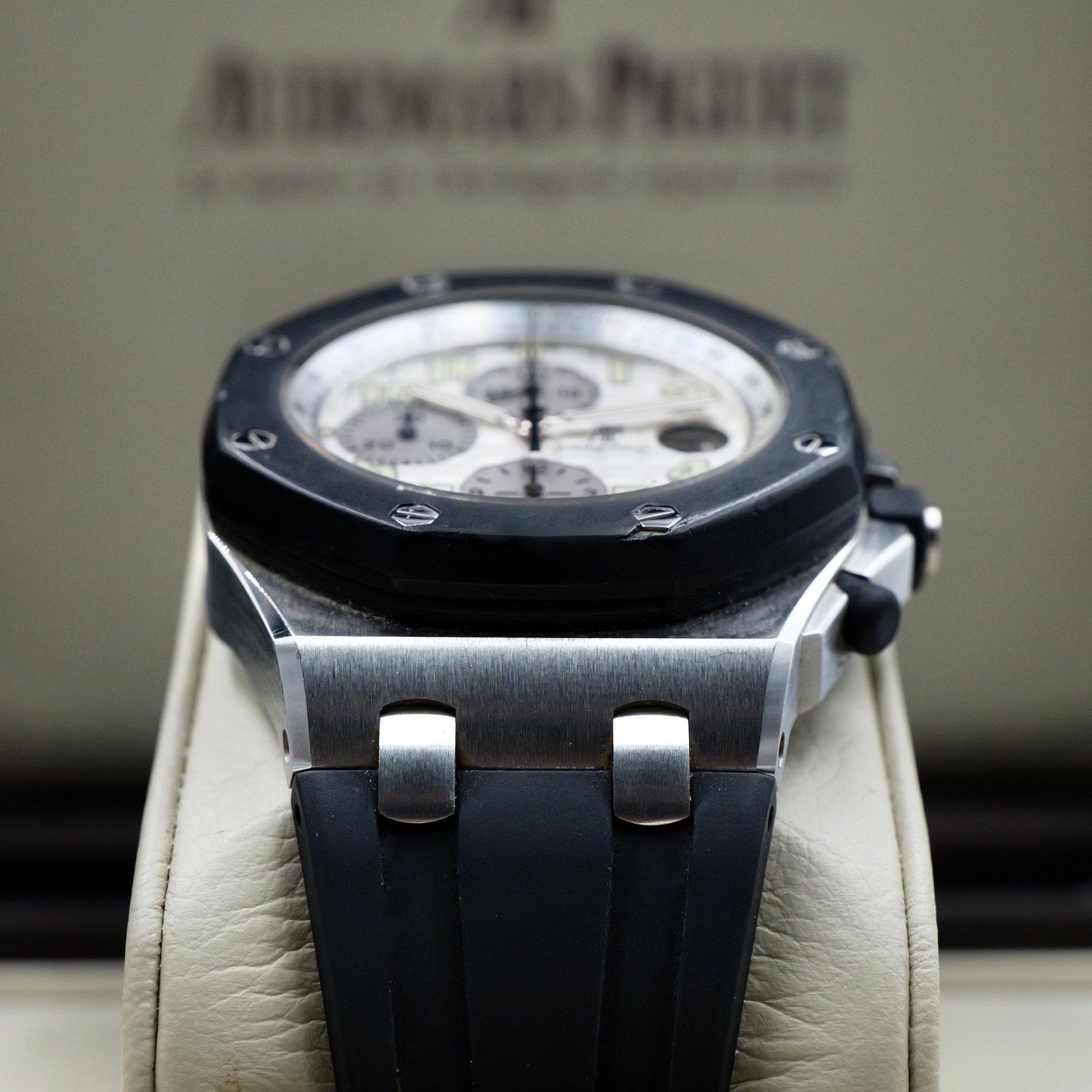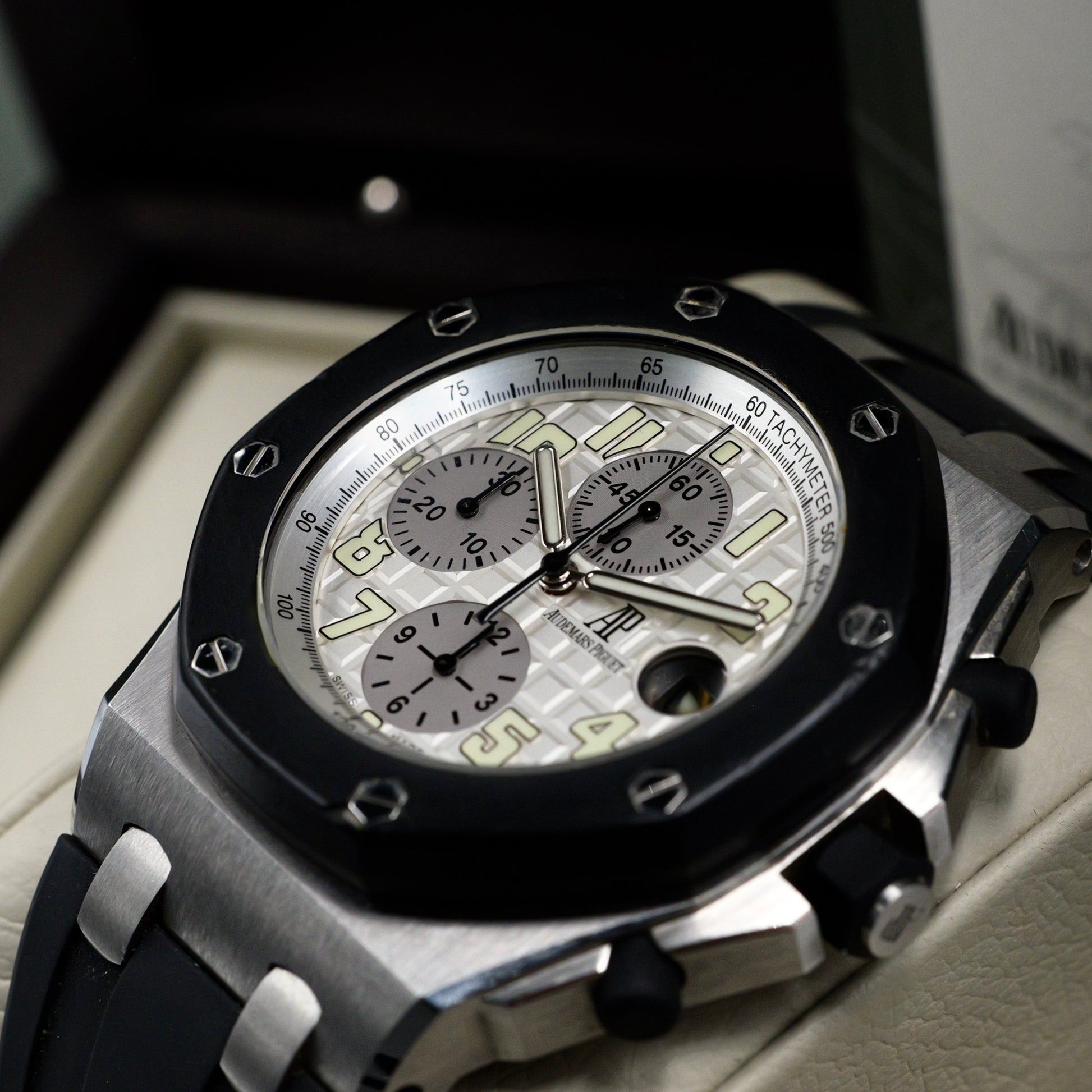 The Audemars Piguet Royal Oak Offshore Chronograph reference 25940SK.OO.D002CA.02.A captures the essence of the Offshore collection—powerful, technical, and instantly recognisable. Crafted in stainless steel with a distinctive white “Méga Tapisserie” dial and black rubber strap, this model delivers an unmistakable combination of strength and refinement.