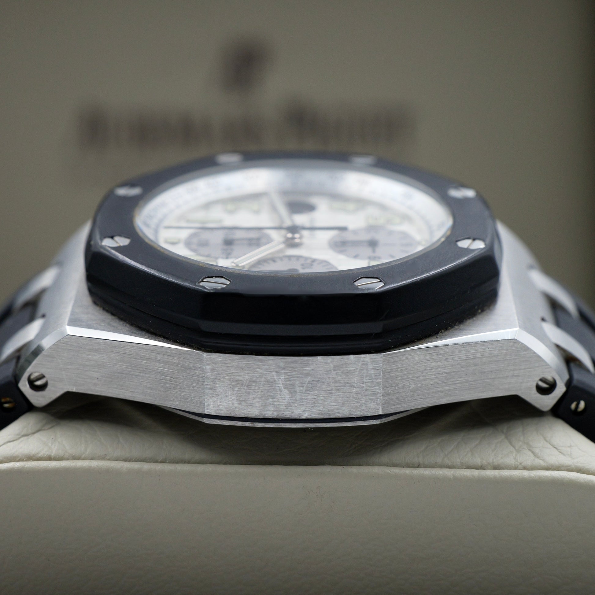 The 42 mm stainless steel case features the Royal Oak’s iconic octagonal bezel in brushed steel, secured with eight polished hexagonal screws. Its robust proportions and black rubber-clad pushers and crown underscore the Offshore’s sporty DNA while ensuring water resistance and durability.