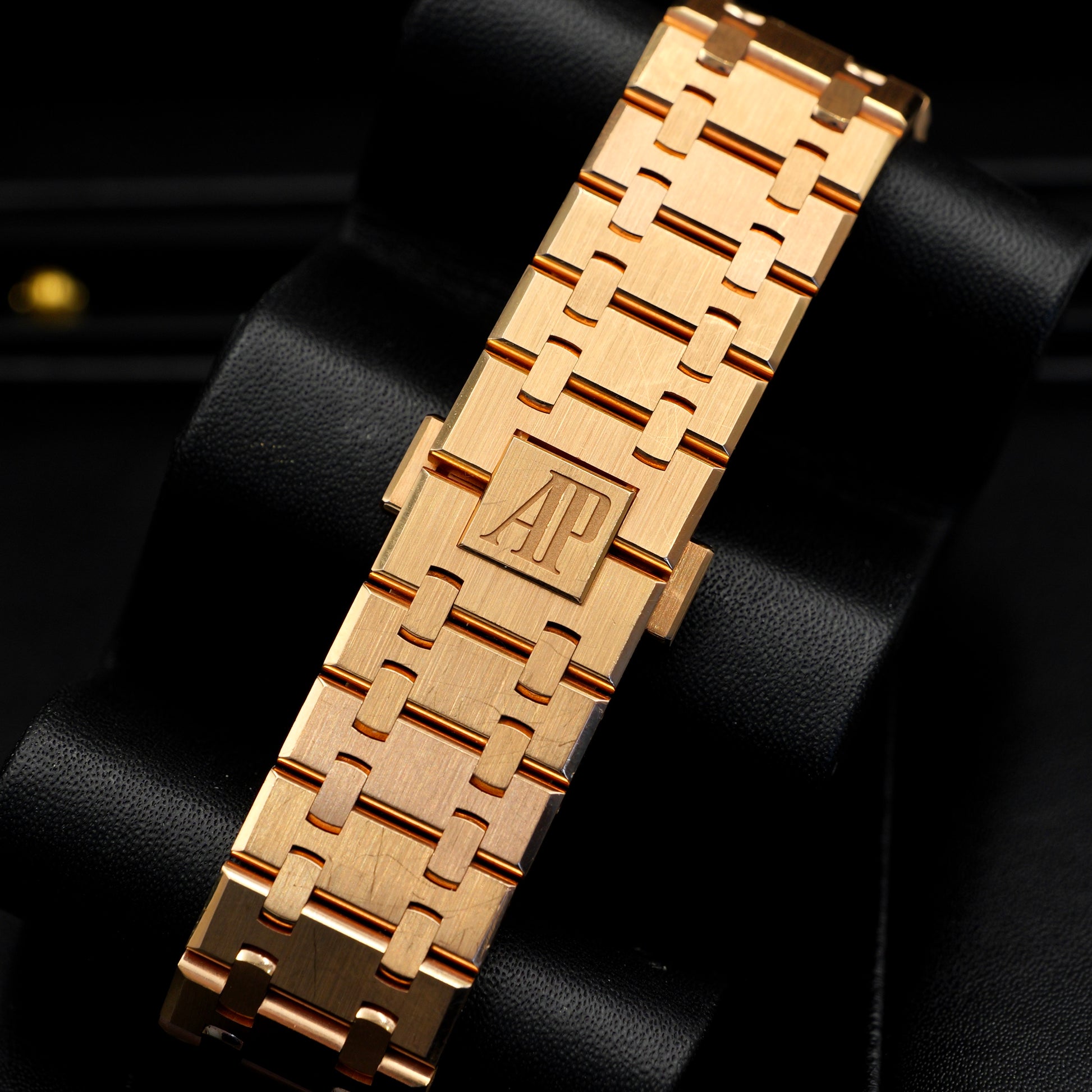 The silver-toned “Grande Tapisserie” dial, complemented by rose gold applied hour markers and luminous hands, offers exceptional clarity and timeless sophistication. Paired with an integrated rose gold bracelet, this Royal Oak is a true symbol of status and craftsmanship—bold, elegant, and uncompromising in every detail.
