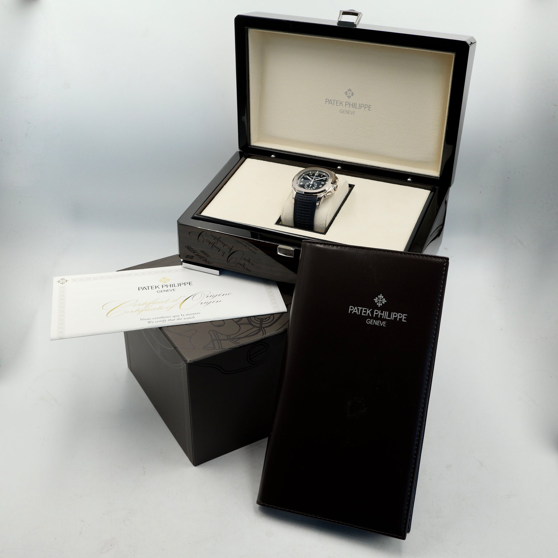 The Patek Philippe Aquanaut Chronograph reference 5968G-001 represents a powerful fusion of contemporary design, high-complication watchmaking, and unmistakable Patek Philippe refinement. Crafted in solid 18 ct white gold and paired with a striking blue embossed dial, this reference elevates the Aquanaut’s sporty DNA into the realm of true haute horlogerie.