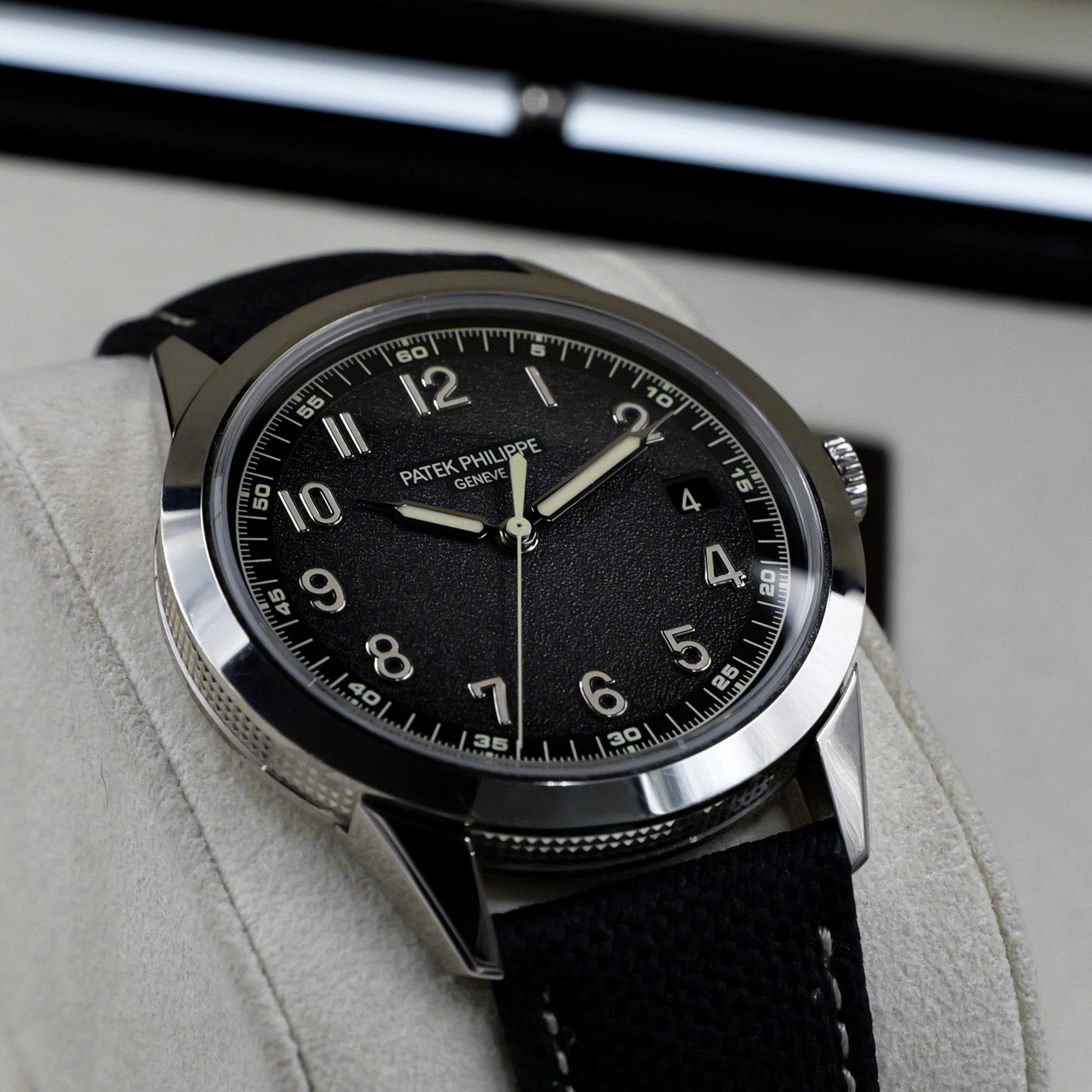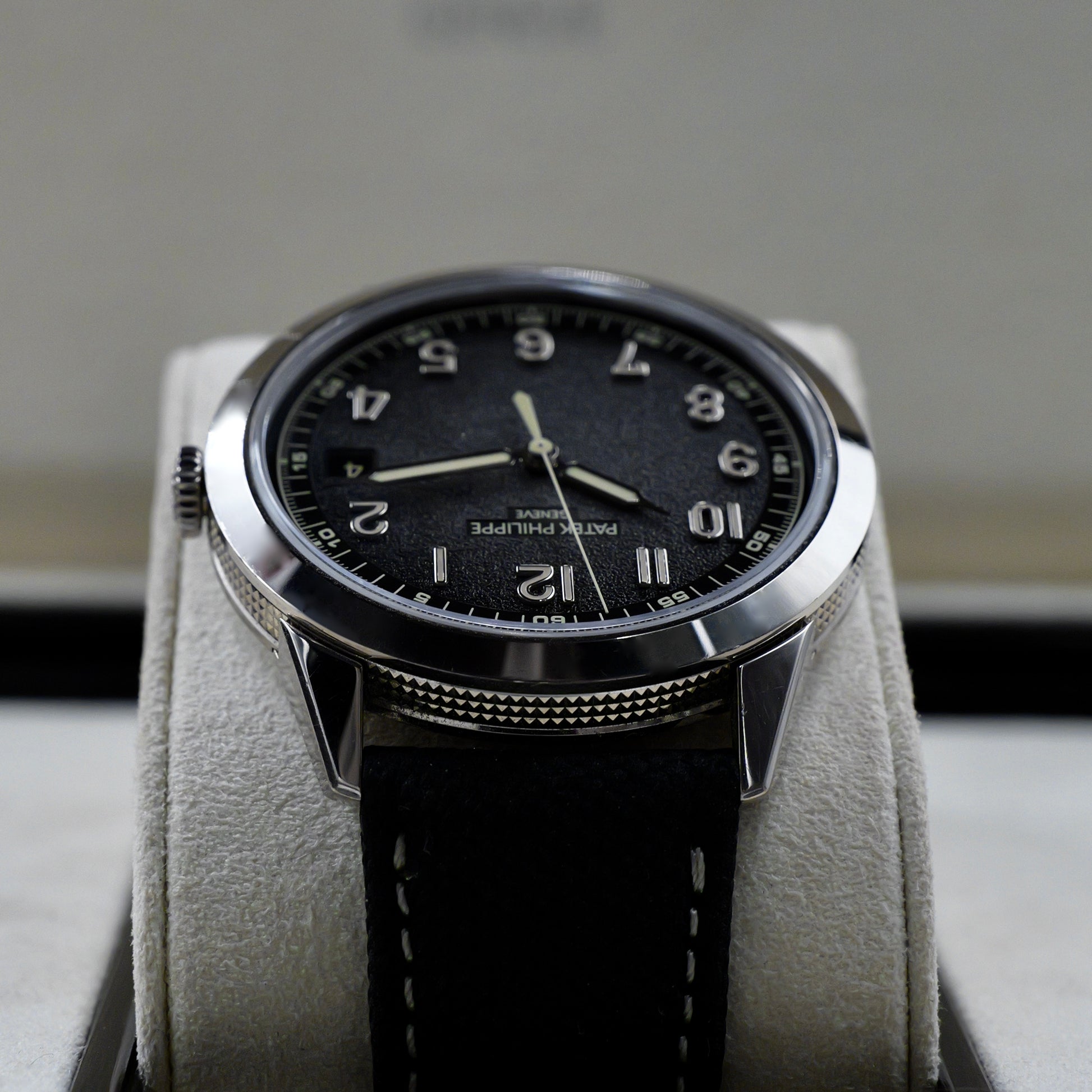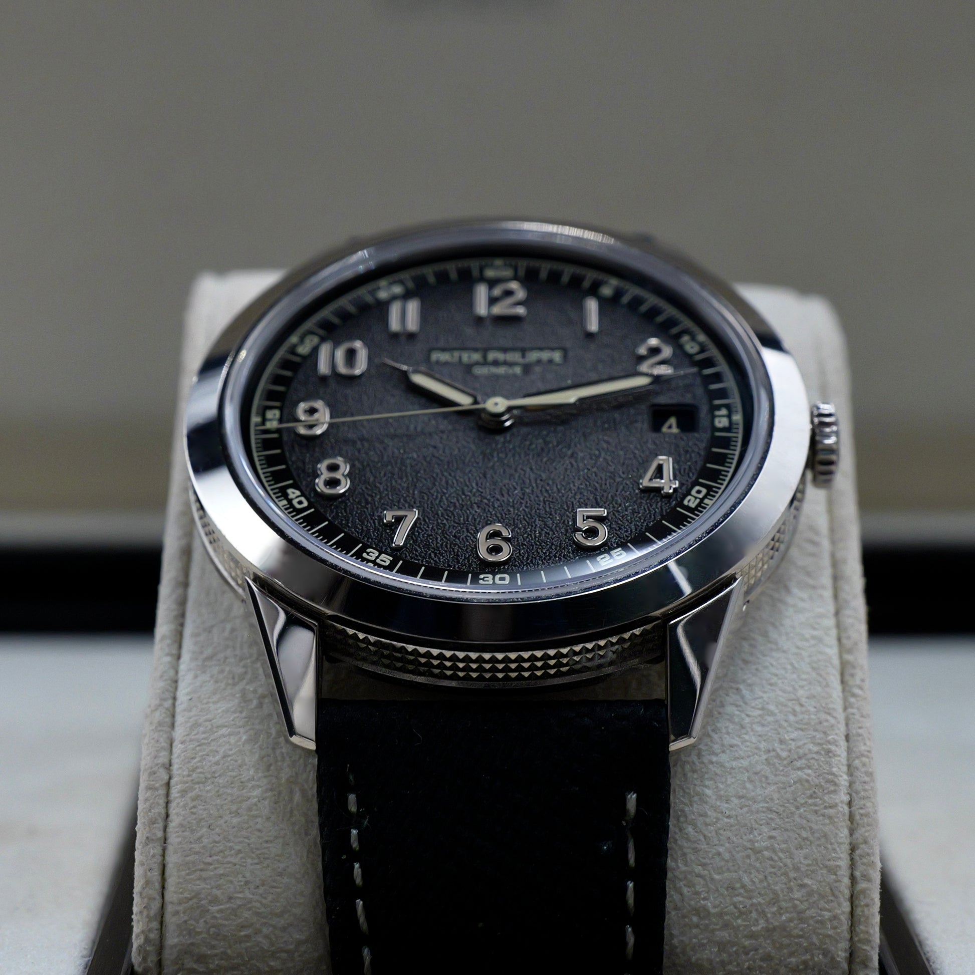 The 40 mm white gold case features Patek Philippe’s signature Clous de Paris hobnail pattern not on the bezel, but uniquely integrated along the case flanks, creating a seamless and distinctive aesthetic. Its textured charcoal-grey dial, finished with a subtle gradient that deepens towards the edges, evokes a vintage spirit. Applied white gold Arabic numerals filled with beige Super-LumiNova and syringe-style hands enhance legibility while adding retro-inspired charm.