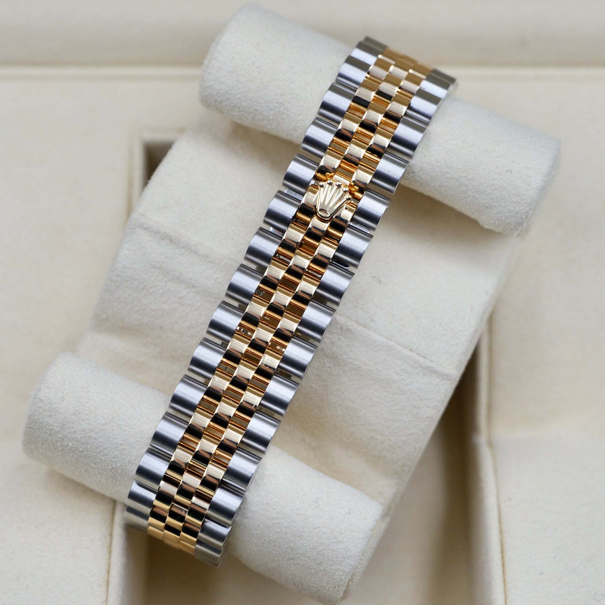 The 31 mm Rolesor case combining the strength of steel with the warmth of yellow gold serves as the perfect canvas for the expertly handset round brilliant-cut diamonds applied throughout. The iconic fluted bezel retains its signature profile while radiating dazzling fire thanks to its pavé diamond finish.
