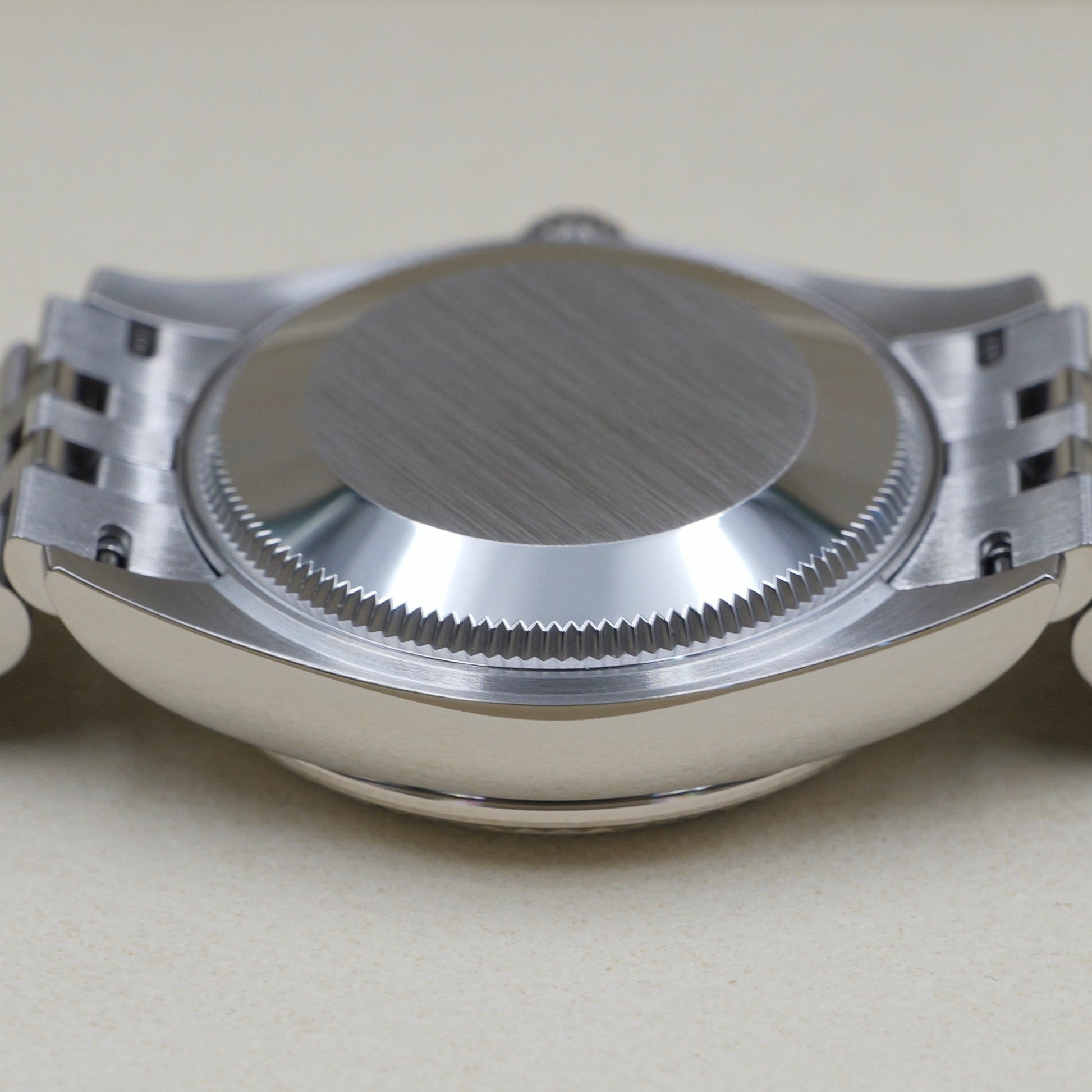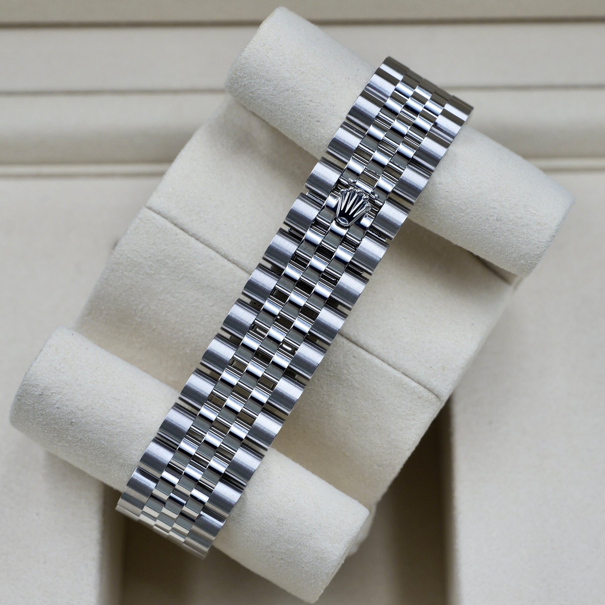 The 31 mm Oyster case delivers a harmonious balance of presence and sophistication, its polished surfaces complementing the radiant white-gold fluted bezel an icon of Rolex design that catches and reflects light with remarkable brilliance. The sunray-finished blue dial adds depth and vibrancy, while the applied white-gold Roman numerals bring classical character and exceptional legibility.