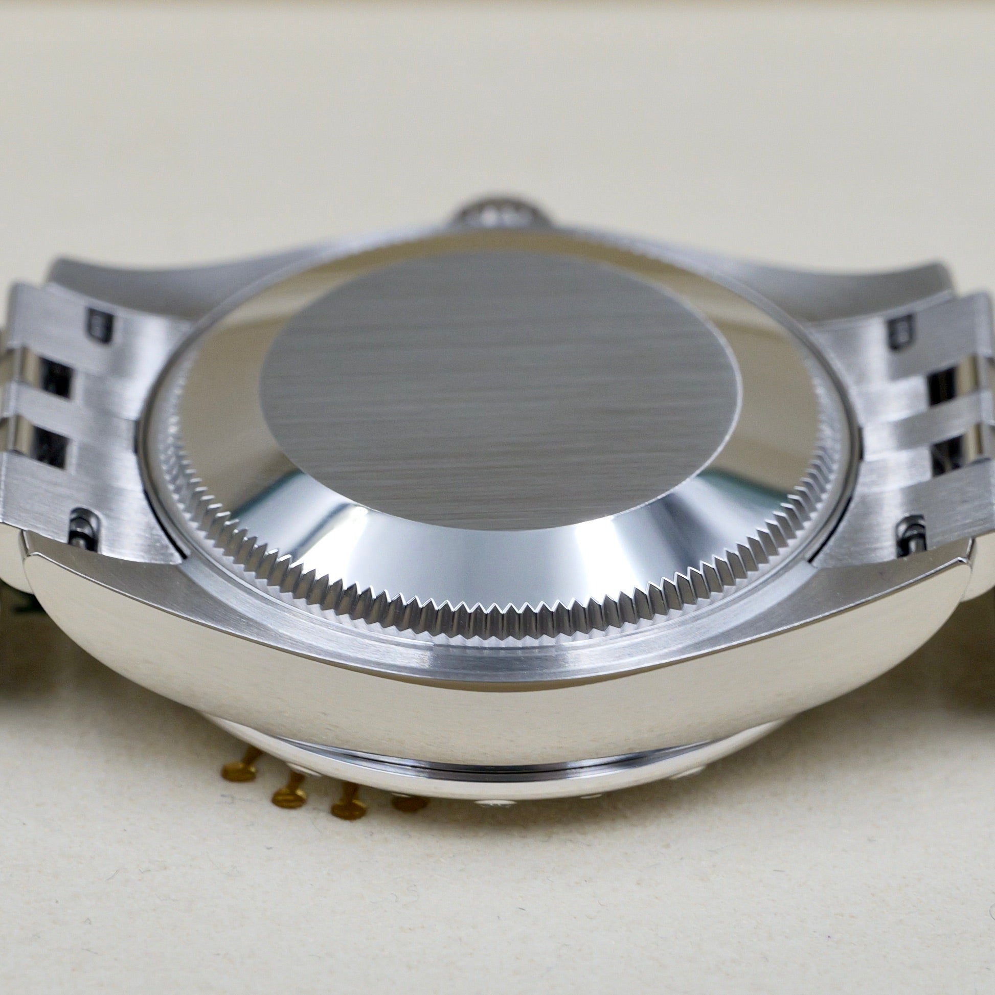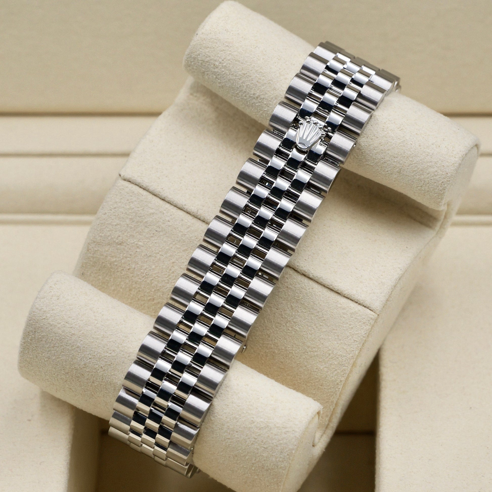 The 31 mm Oyster case is beautifully proportioned for elegant everyday wear, polished to a flawless finish and crowned by a domed bezel meticulously set with brilliant-cut diamonds. This radiant frame elevates the watch’s jewellery-like presence while preserving the iconic Datejust silhouette. The deep green sunray-finished dial adds depth and character, shifting subtly under the light and complemented by applied white-gold hour markers and polished hands.