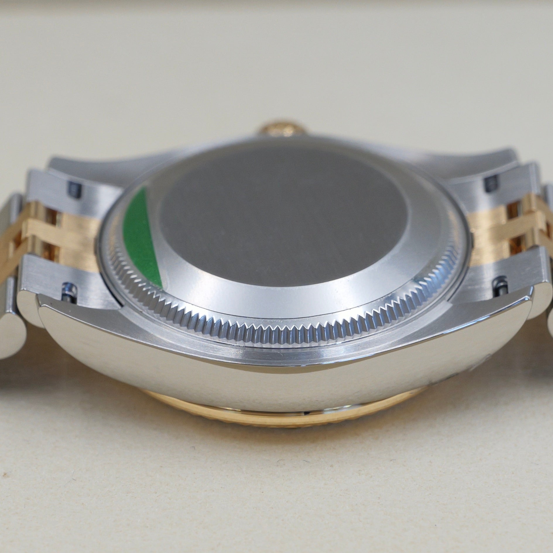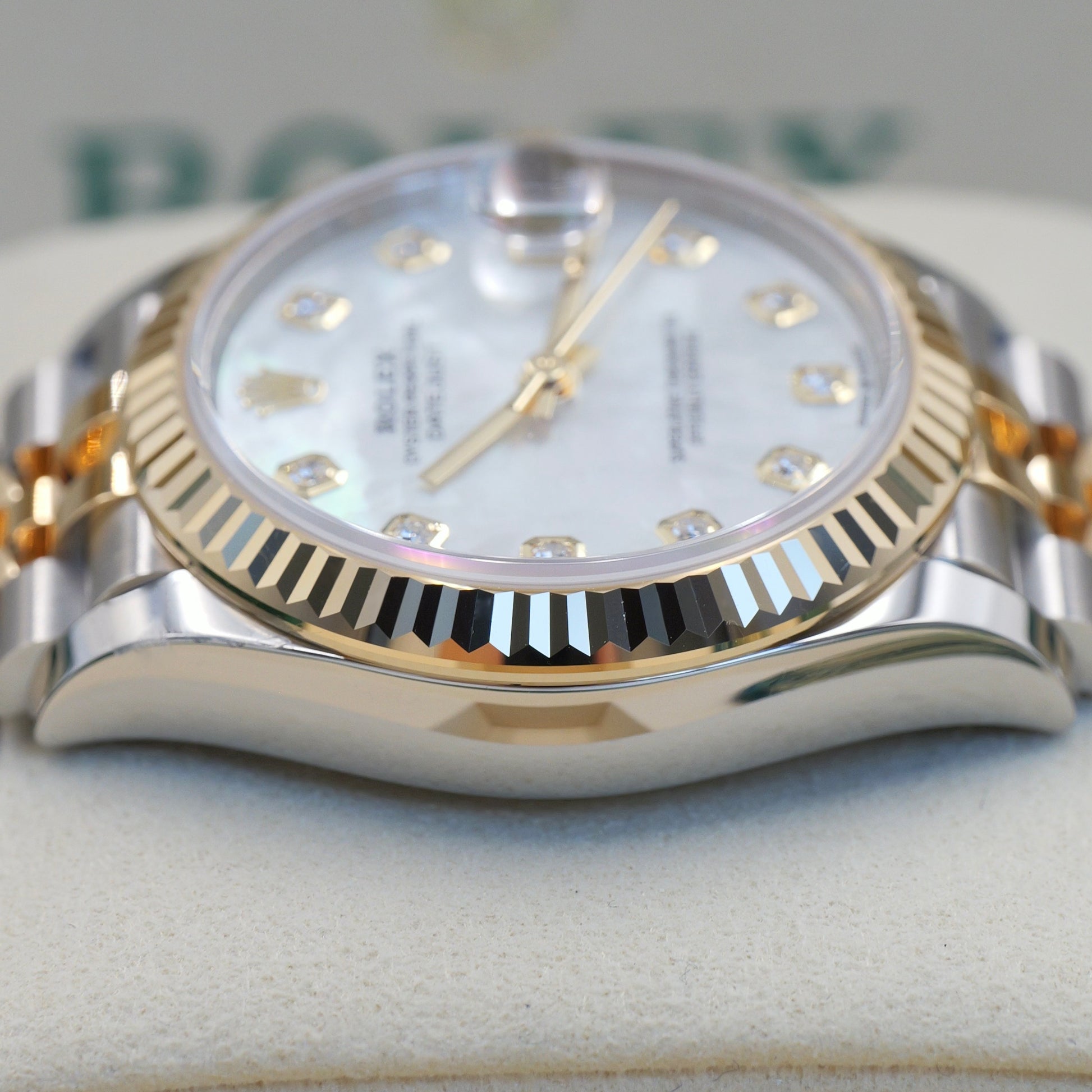 The 28 mm Oyster case combines polished Oystersteel with warm yellow gold, crowned by the signature fluted bezel that shimmers with every movement. The iridescent mother-of-pearl dial is unique to each watch, offering a natural interplay of light and color. Applied yellow-gold hour markers and polished hands ensure a harmonious aesthetic, while the date display at 3 o’clock magnified by the iconic Cyclops lens delivers practicality with timeless elegance.