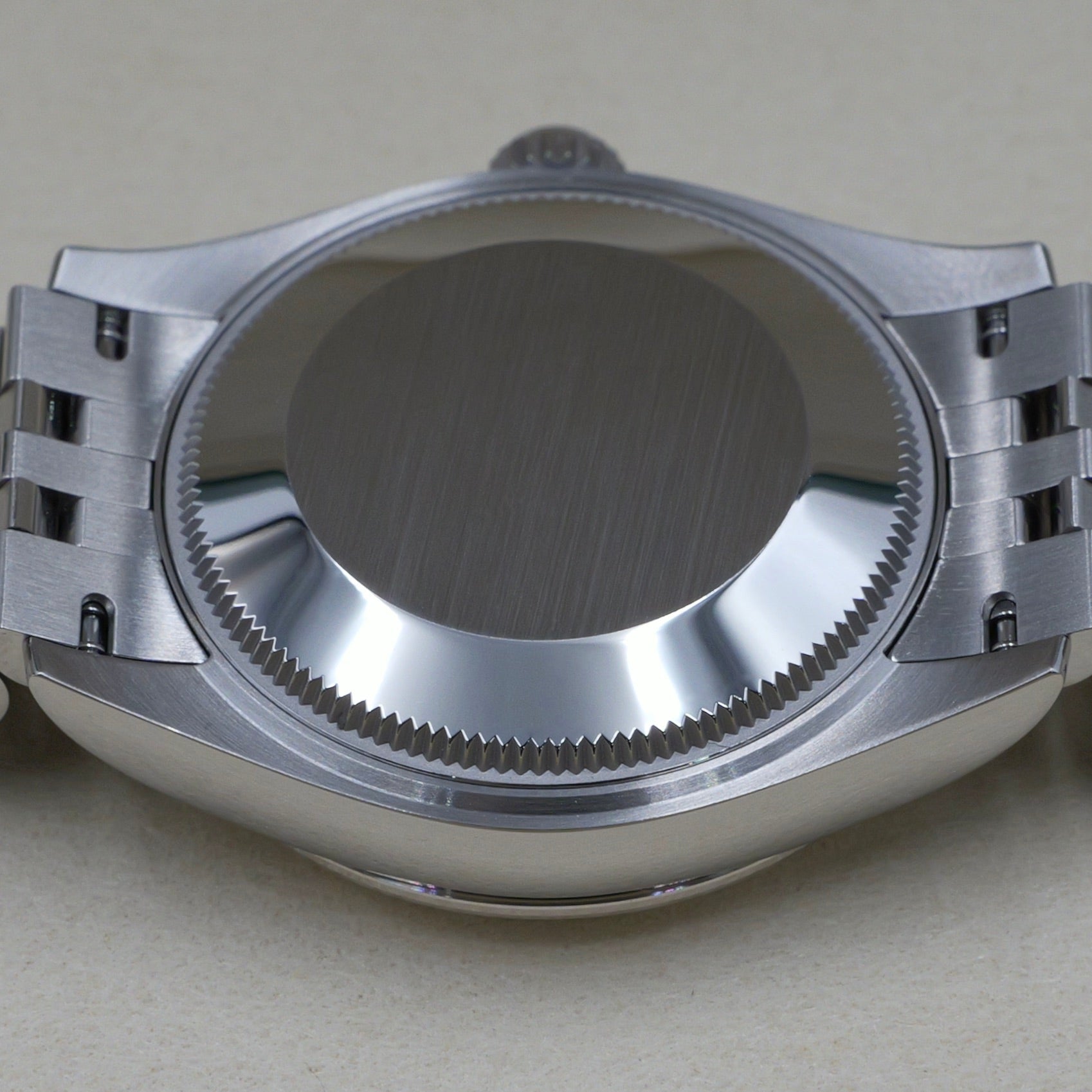 The 31 mm Oyster case, crafted from robust Oystersteel and crowned with Rolex’s iconic fluted bezel in solid white gold, delivers both durability and refined brilliance. The rhodium dial, with its cool metallic sheen, offers depth and sophistication, enhanced by applied white-gold Roman numerals and polished hands. The date window at 3 o’clock—magnified by the signature Cyclops lens adds both functionality and harmony to the composition.