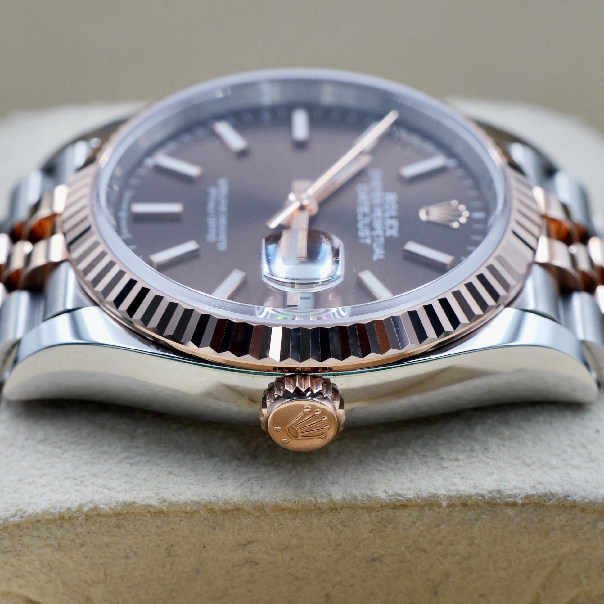 The Rolex Datejust 36 reference 126231 in Oystersteel and 18ct Everose gold perfectly captures the harmony between classic sophistication and contemporary allure. Paired with a rich chocolate sunray-finished dial and the graceful Jubilee bracelet, this configuration embodies understated luxury and enduring style.
