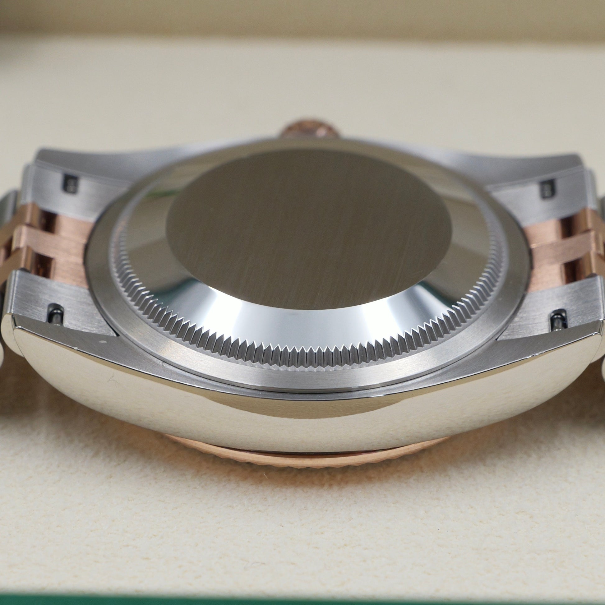The 36 mm Oyster case combines polished Everose gold and brushed Oystersteel, crowned by Rolex’s signature fluted bezel in solid 18 ct Everose gold, catching the light with every movement. The chocolate dial radiates warmth and depth, highlighted by luminous Everose gold baton hour markers and matching hands. At 3 o’clock, the date display magnified by the Cyclops lens, adds both balance and practicality to the design.