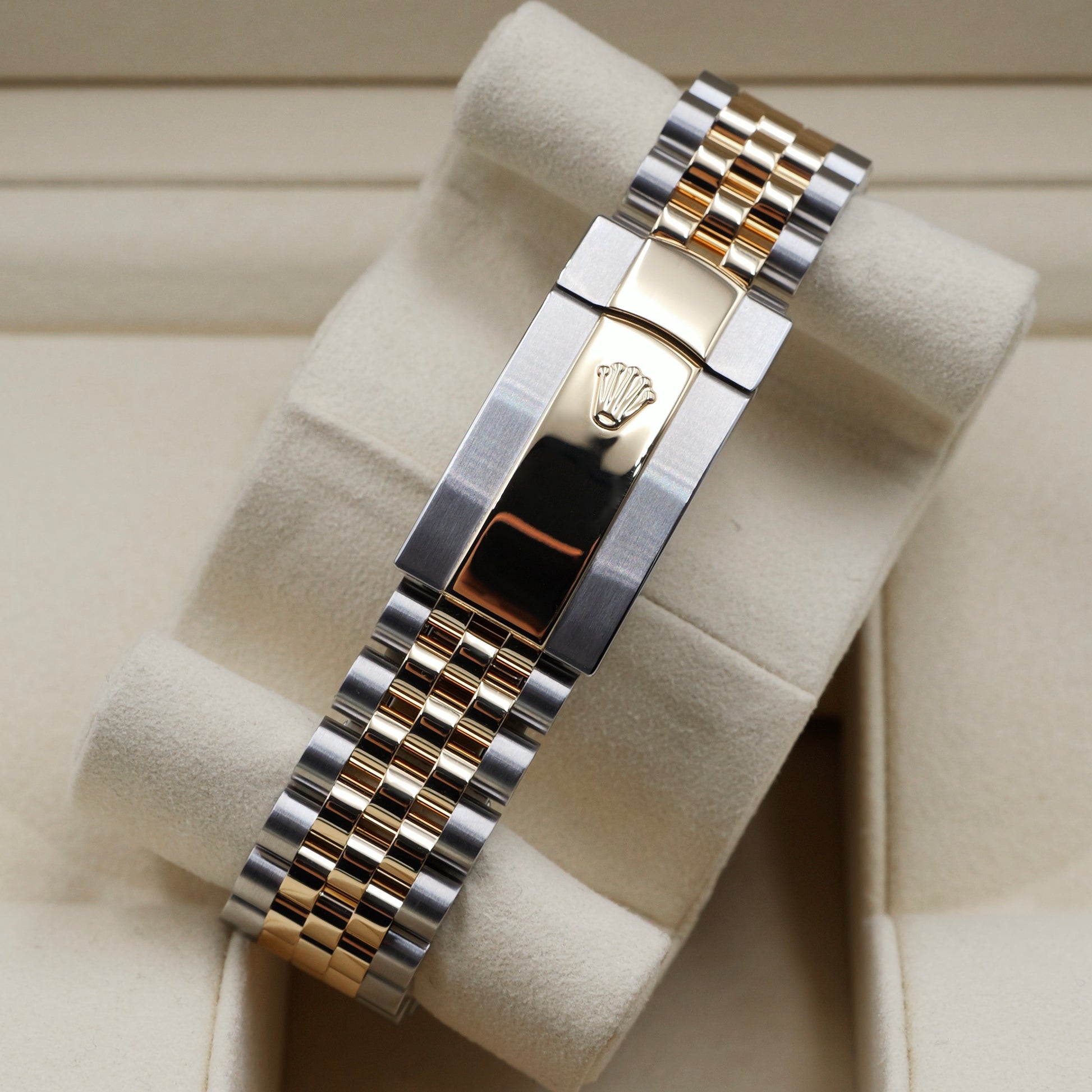 The 36 mm Oyster case is framed by the brilliant 18ct yellow gold fluted bezel, a Rolex hallmark that reflects light with every movement. The champagne Computer dial, with its intricate repeating “ROLEX” pattern, creates a mesmerizing texture that plays beautifully with the light. Applied yellow-gold baton hour markers and polished hands provide a refined contrast, while the date window at 3 o’clock magnified by the Cyclops lens delivering practical elegance.