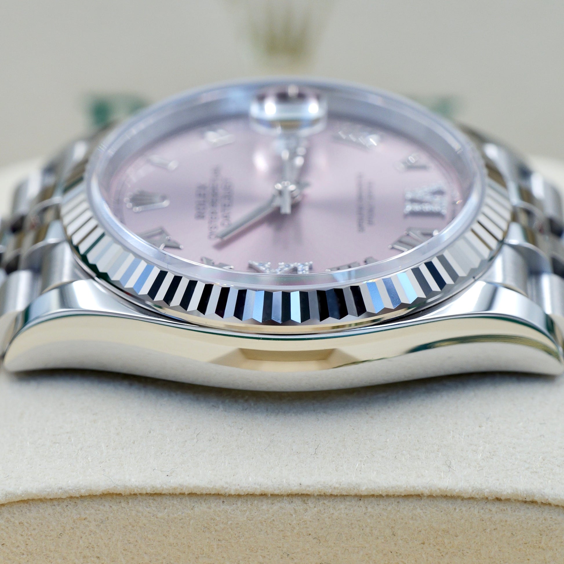 The 36 mm Oyster case, crafted from corrosion-resistant Oystersteel and topped with a white gold fluted bezel, radiates light with every movement. The pink dial offers a subtle warmth and depth, brought to life by the sunburst finish that shifts beautifully under changing light. Ten applied white-gold hour markers are complemented by the brilliant-cut diamond numerals at six and nine o’clock, adding a touch of sparkle and charm to the classic Datejust aesthetic.
