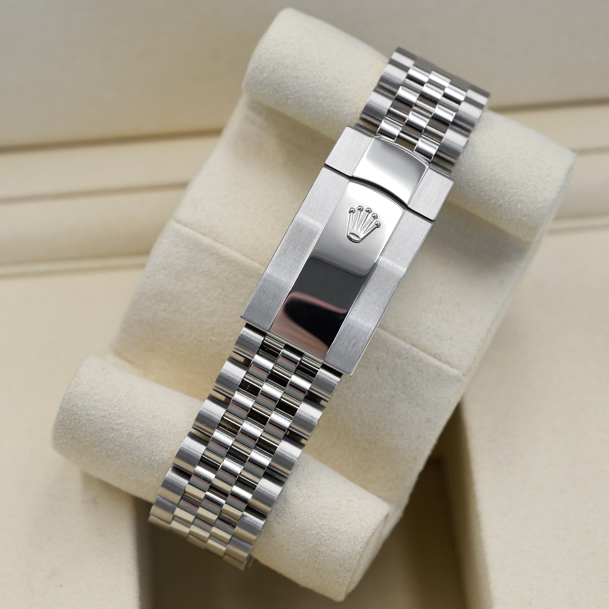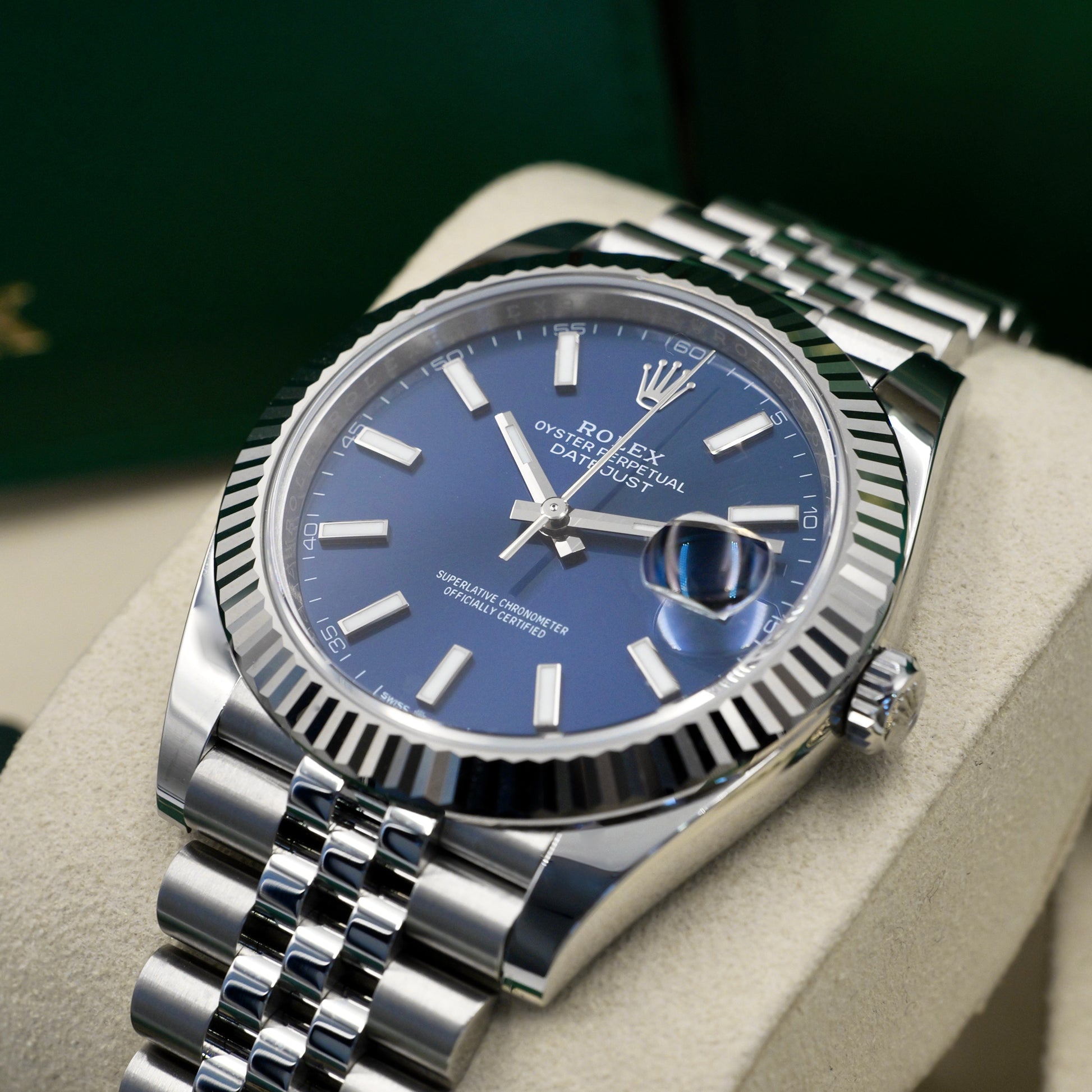 The Rolex Datejust 41 ref. 126334 with blue sunburst baton dial is a striking expression of elegance and precision. Housed in a 41mm Oystersteel case with a luminous 18k white gold fluted bezel, this configuration offers a bold yet balanced presence on the wrist.