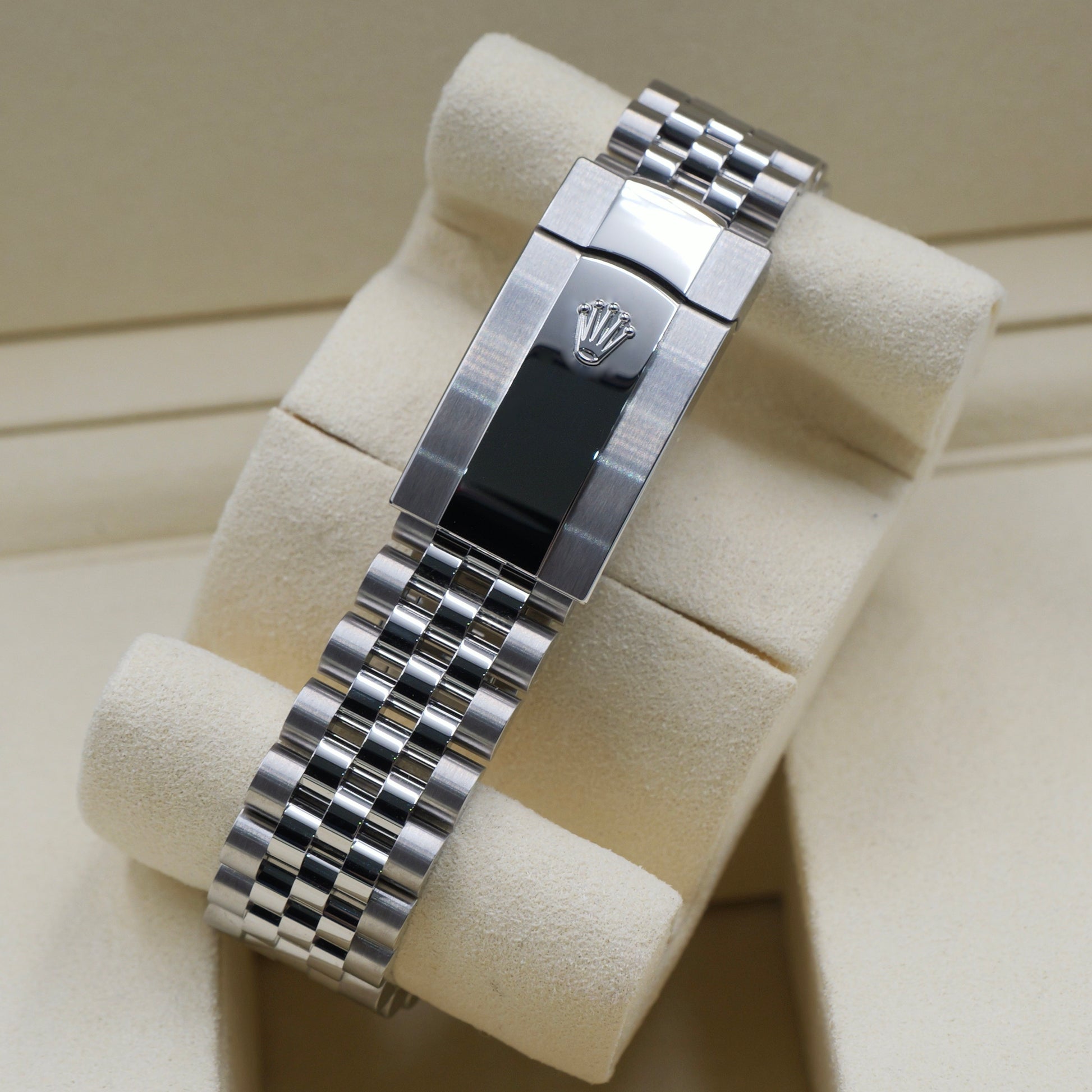 The mint green sunburst dial, adorned with white gold hour markers and Chromalight luminescence, offers exceptional readability with a fresh, contemporary aesthetic. Paired with the Jubilee bracelet, renowned for its comfort and five-link design, this Datejust 41 is the perfect blend of classic style and modern Rolex craftsmanship—a true icon of enduring luxury.