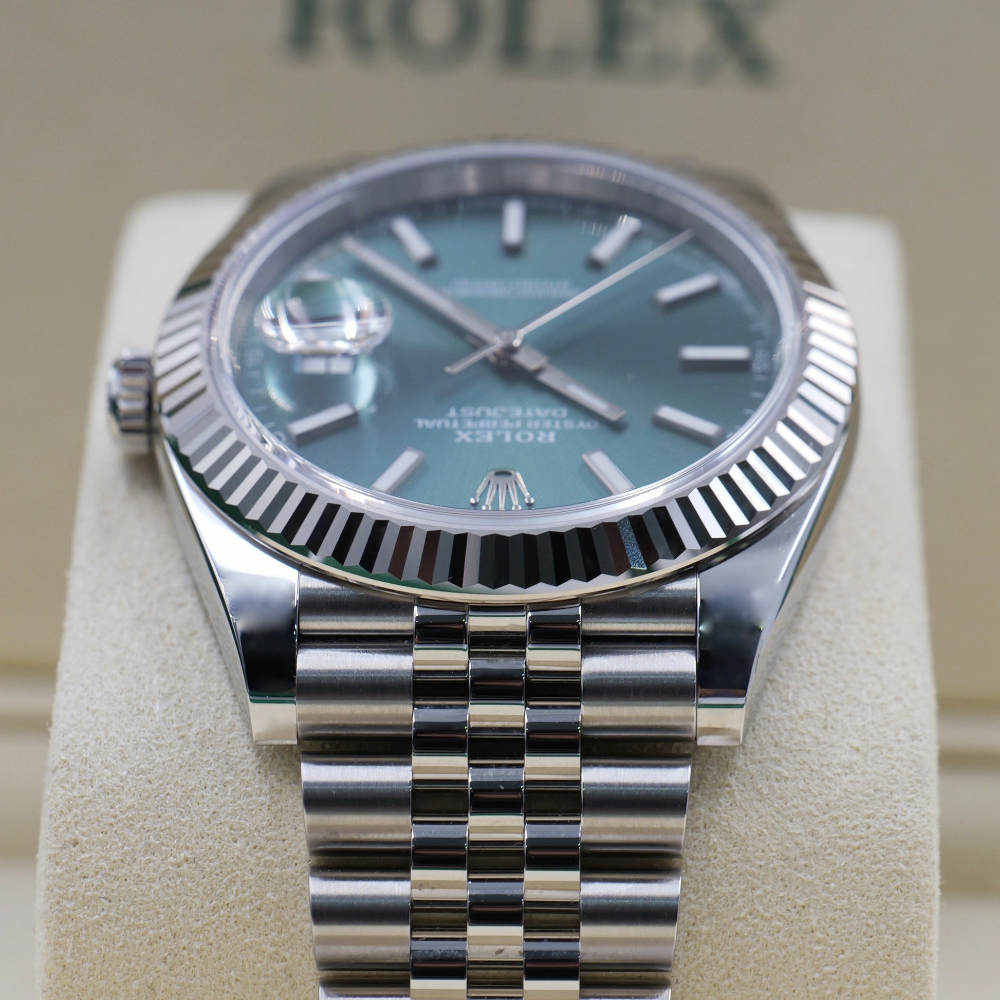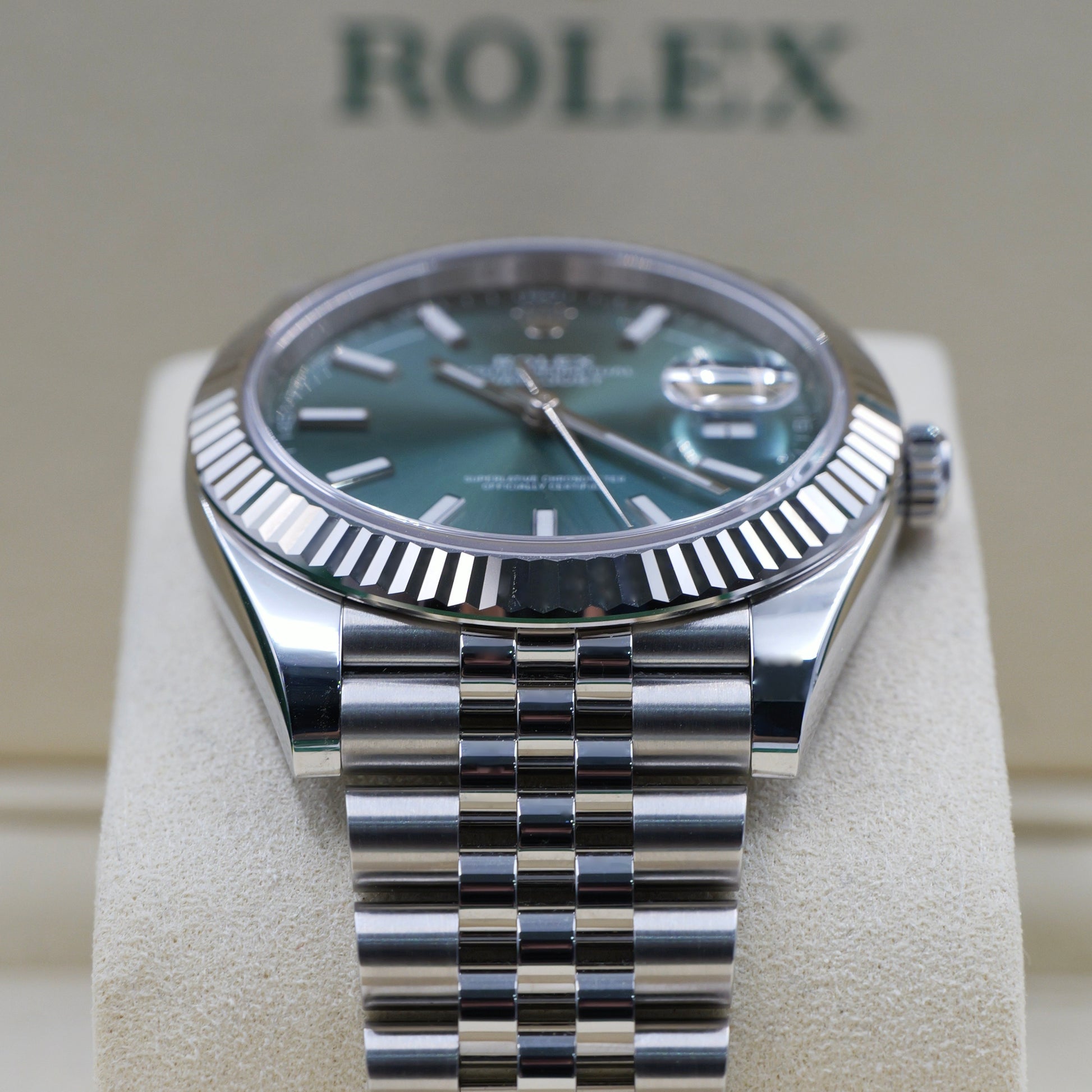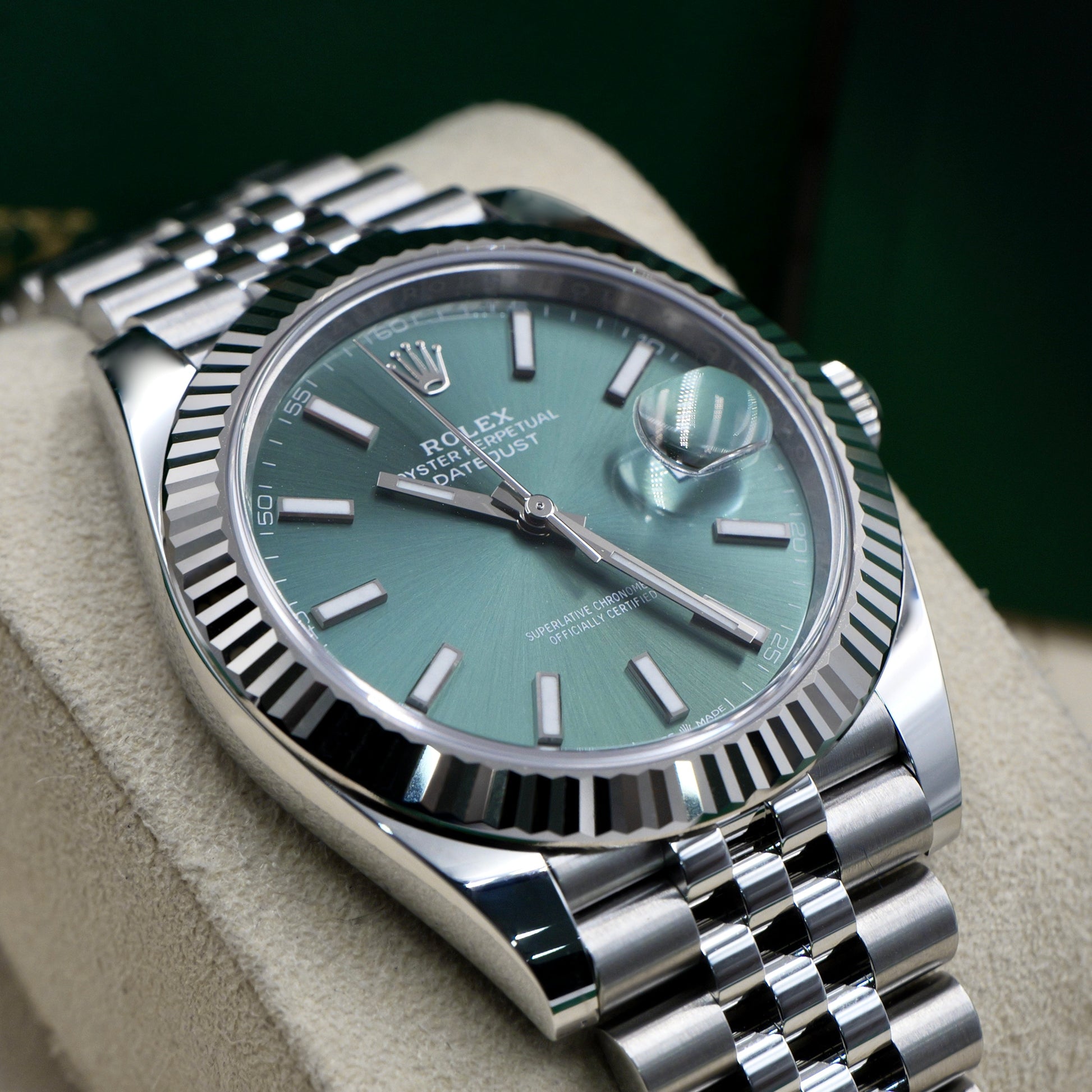 The Rolex Datejust 41 with a mint green dial is a refined expression of timeless sophistication. Its 41mm Oystersteel case, paired with a fluted bezel in 18k white gold, creates a striking and luxurious profile, perfect for any occasion.