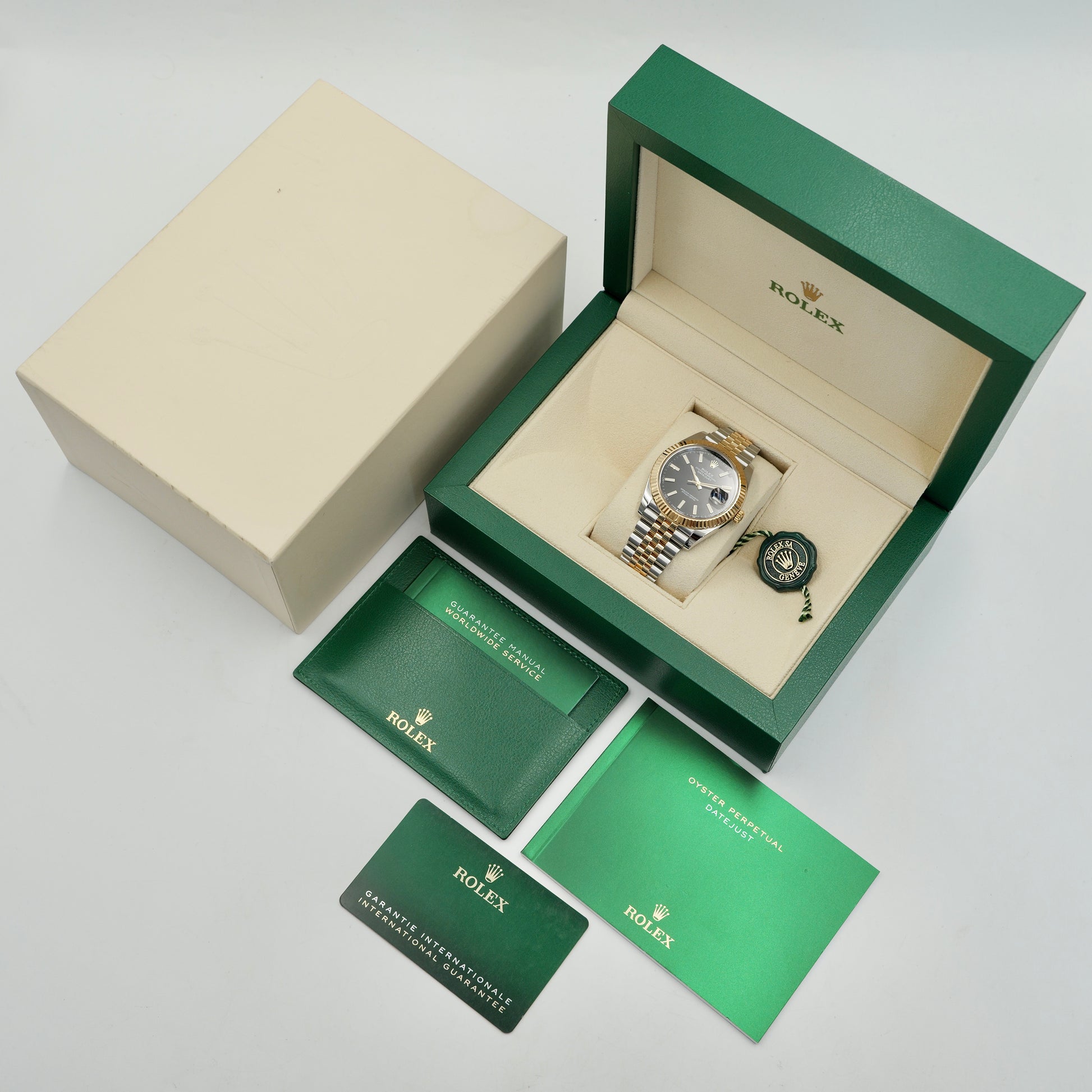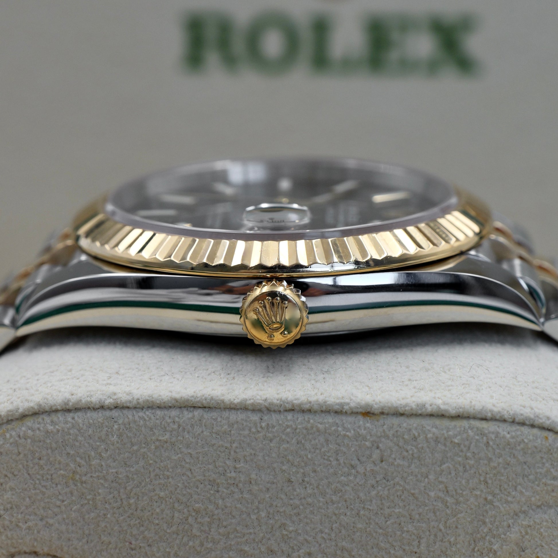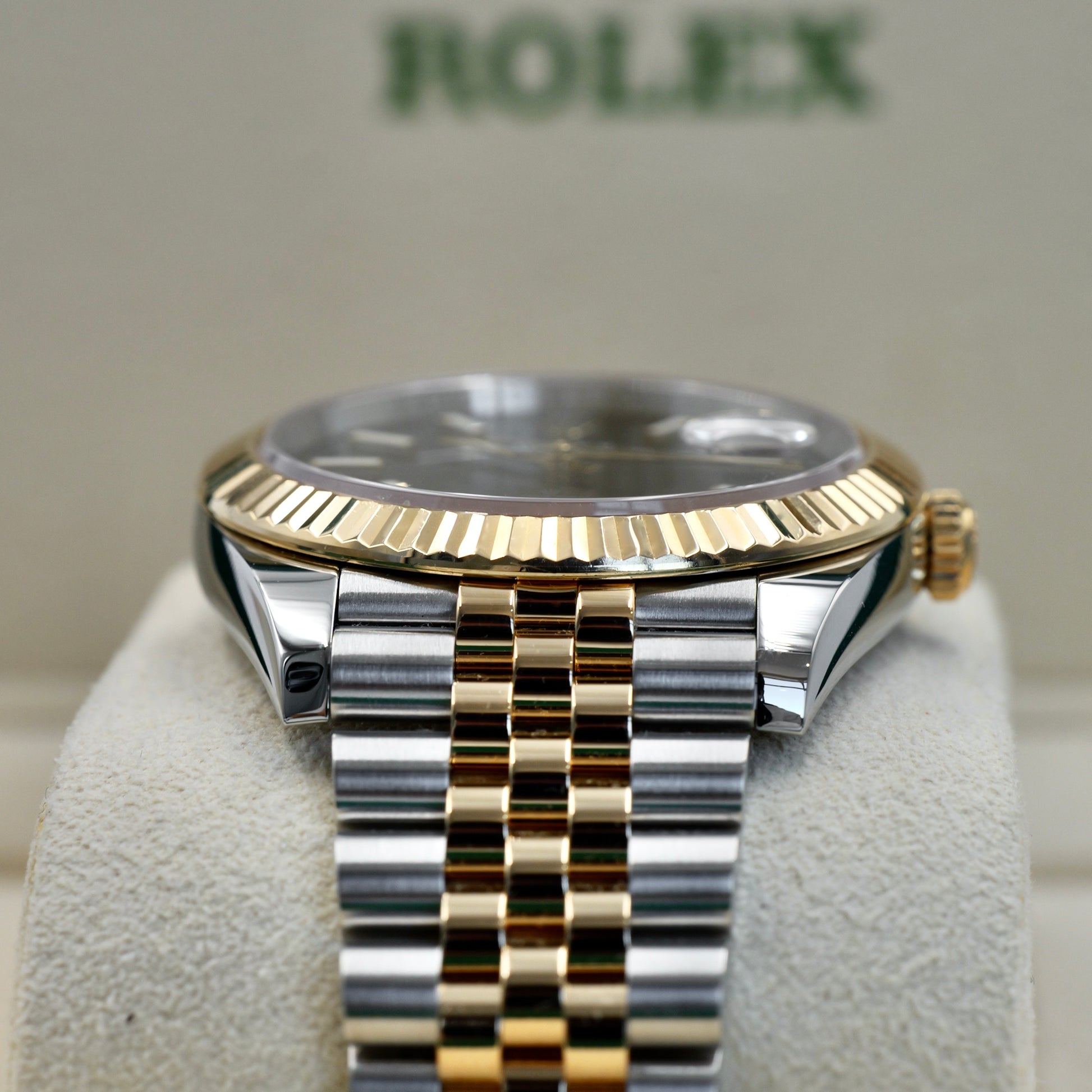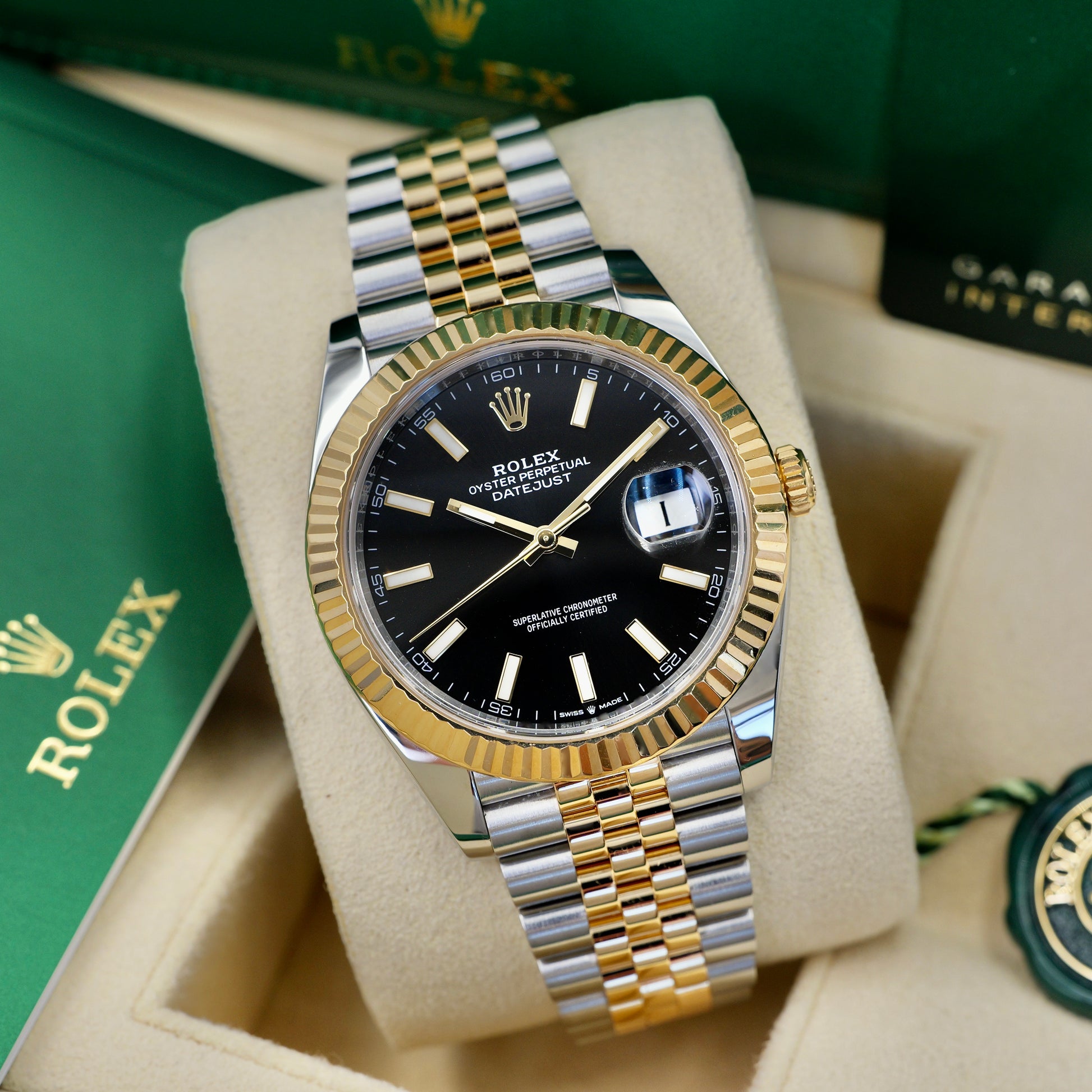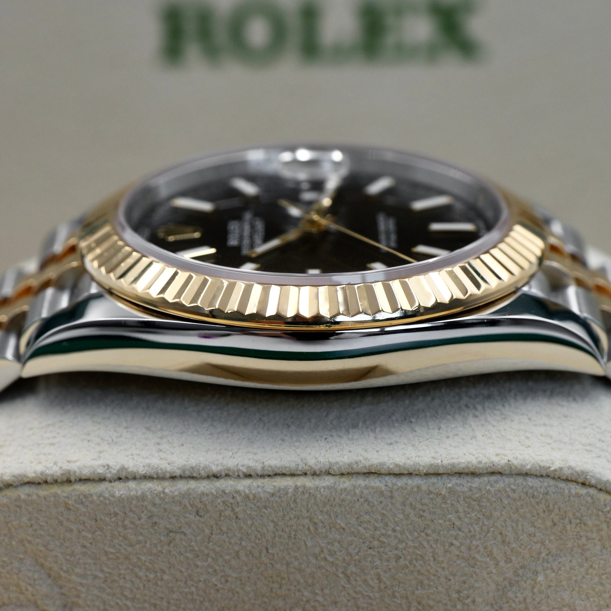 A bold balance of classic aesthetics and modern refinement.The Rolex Datejust 41 126333 in stainless steel and 18k yellow gold, paired with a sleek black sunburst dial, exudes confident sophistication. Its 41mm Oyster case, crowned with the timeless fluted bezel, delivers a commanding yet elegant presence that transitions effortlessly from formal to everyday wear.