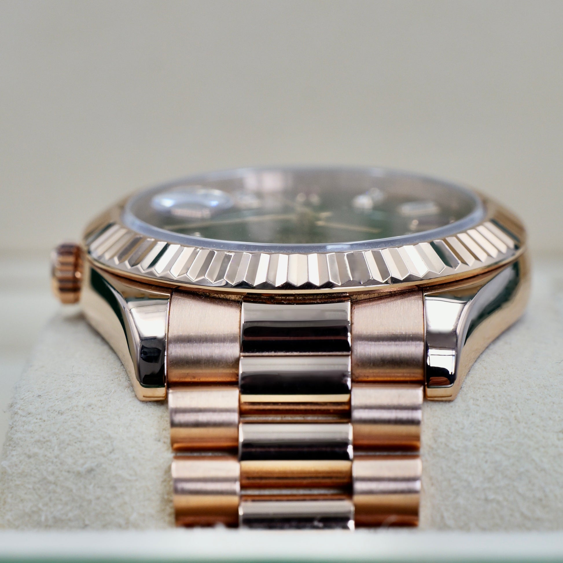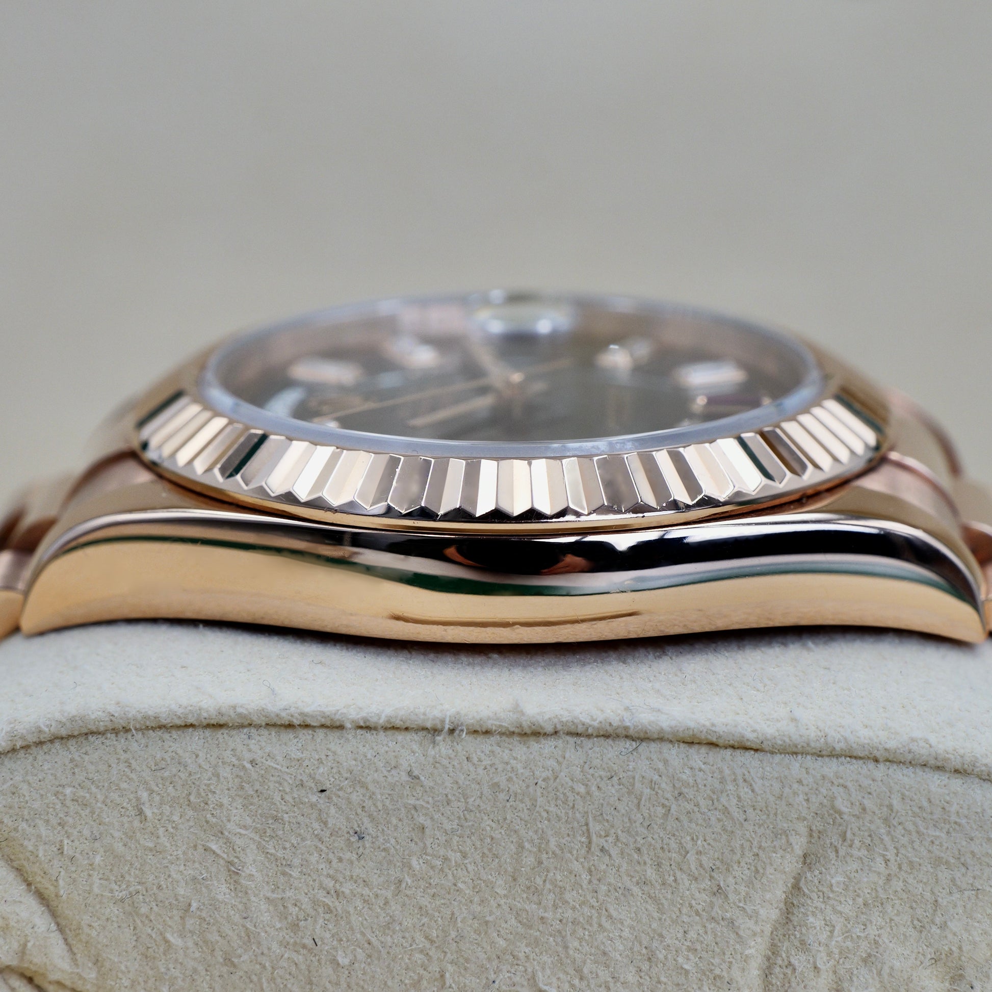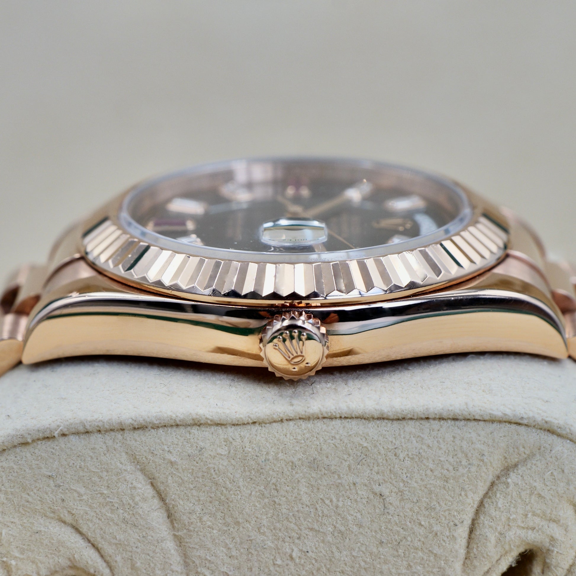 The Rolex Day-Date 40 in 18k Everose gold, featuring a captivating ruby-set dial, elevates the iconic President’s watch into the realm of haute horlogerie. Its 40mm Oyster case, flawlessly polished and expertly proportioned, radiates warmth and luxury from every angle.