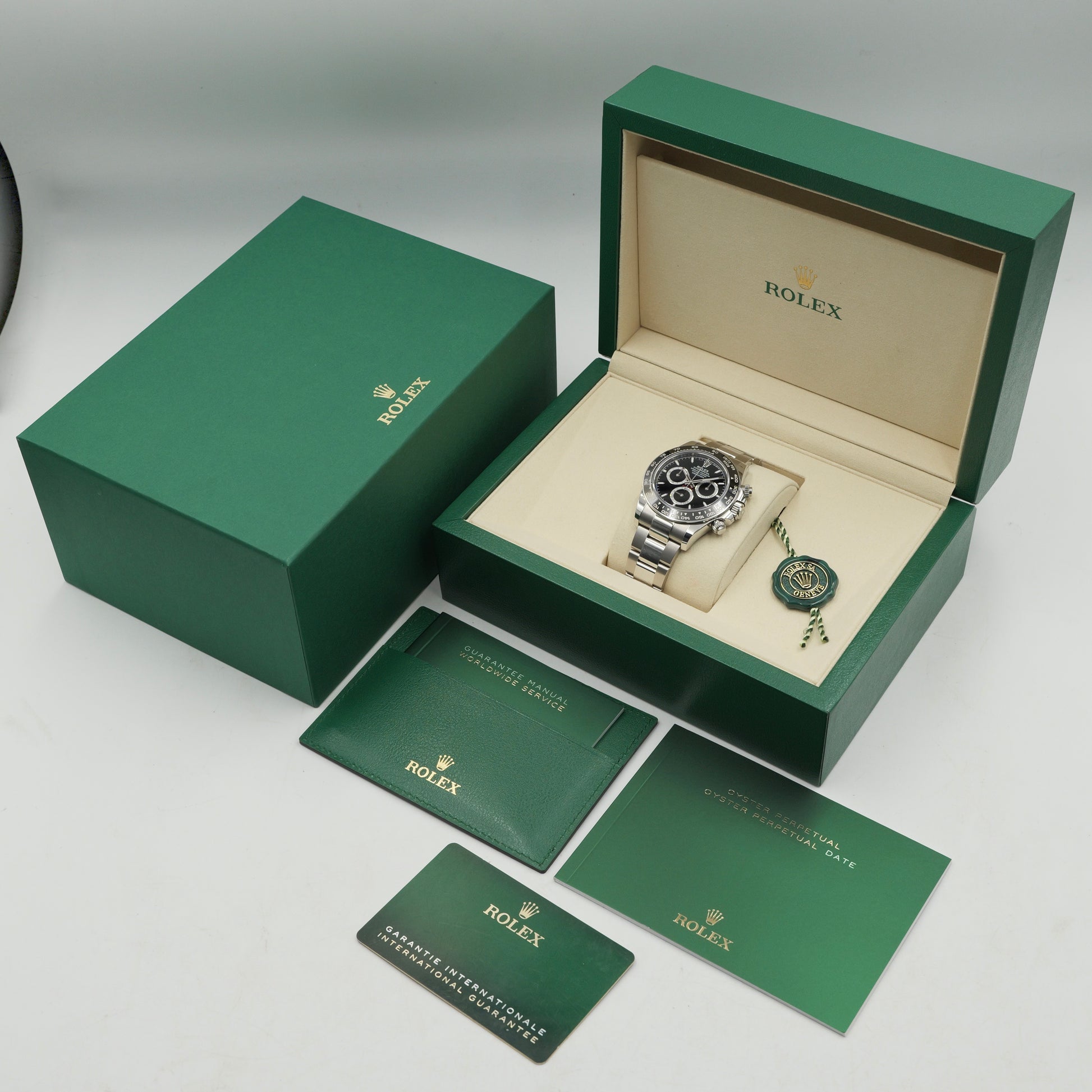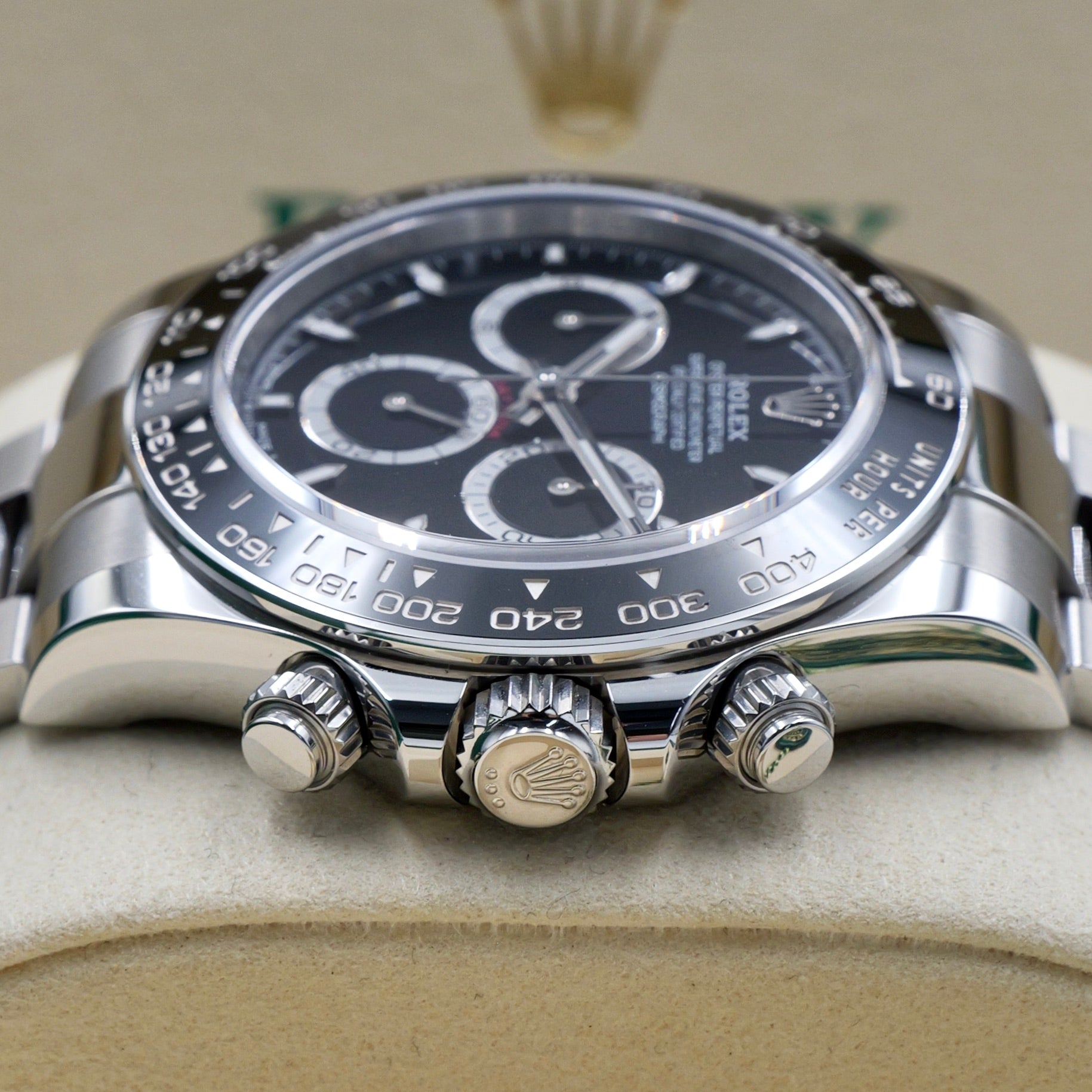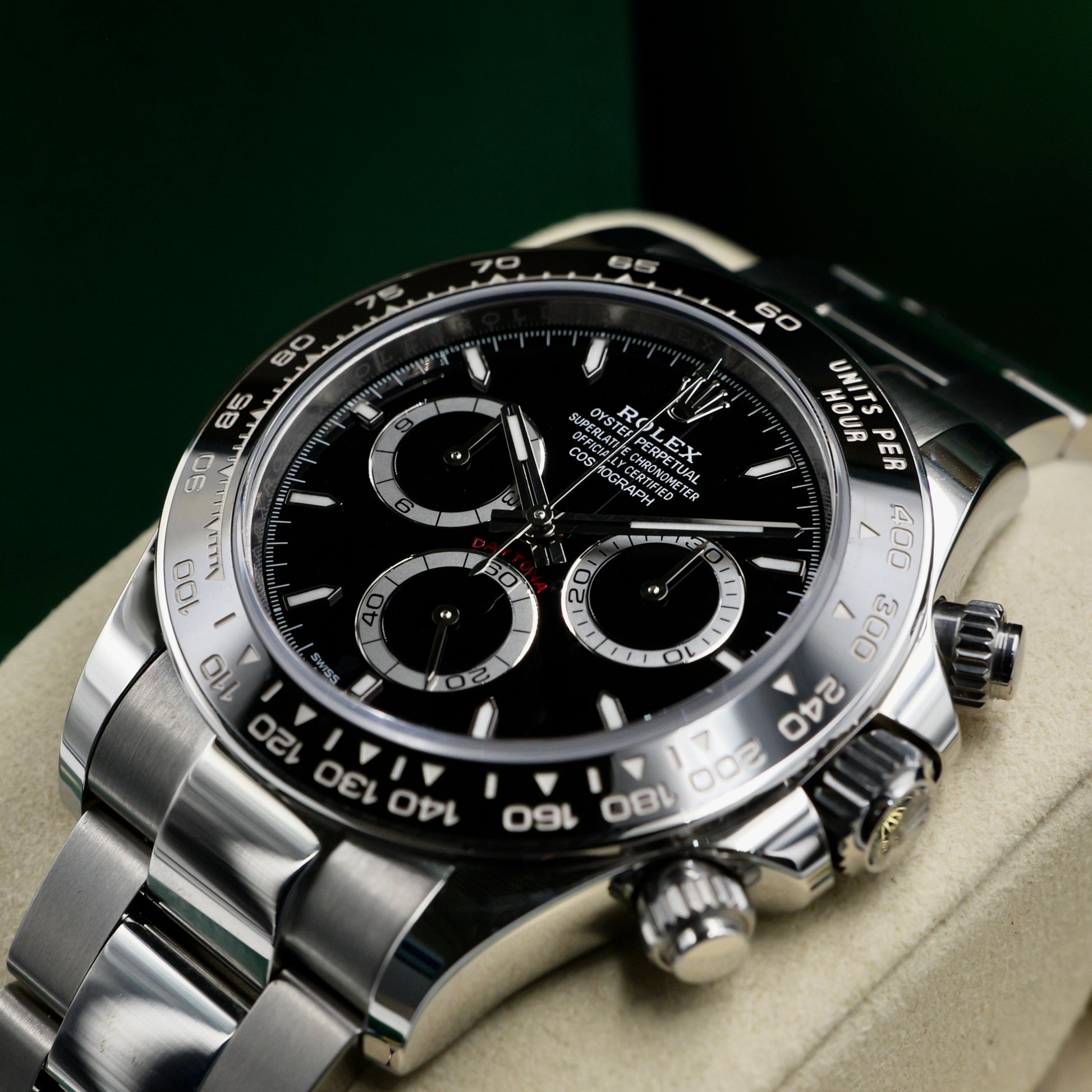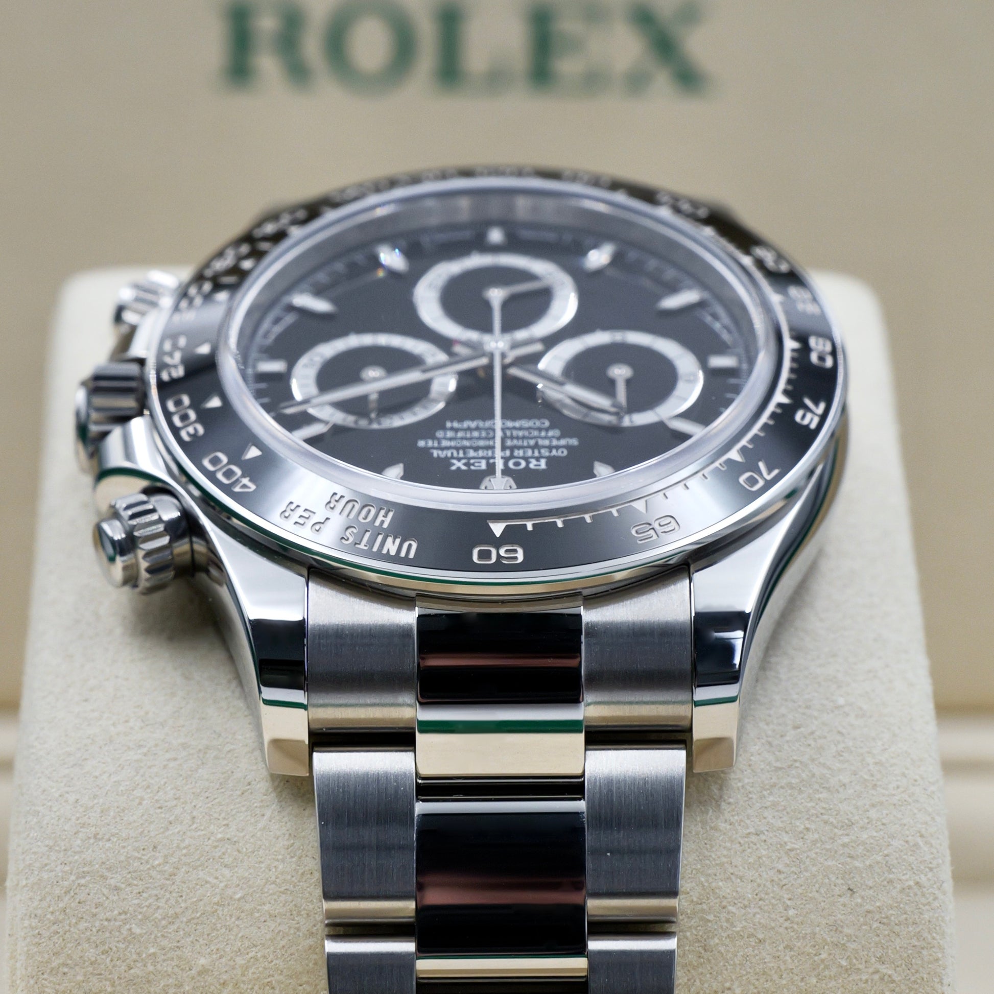 The deep black dial, featuring contrasting white sub-dials, ensures impeccable legibility, while Chromalight luminescence enhances visibility in any light. Paired with the robust Oyster bracelet, this Daytona is a true symbol of endurance, precision, and Rolex’s legendary status in the world of high-performance timepieces.