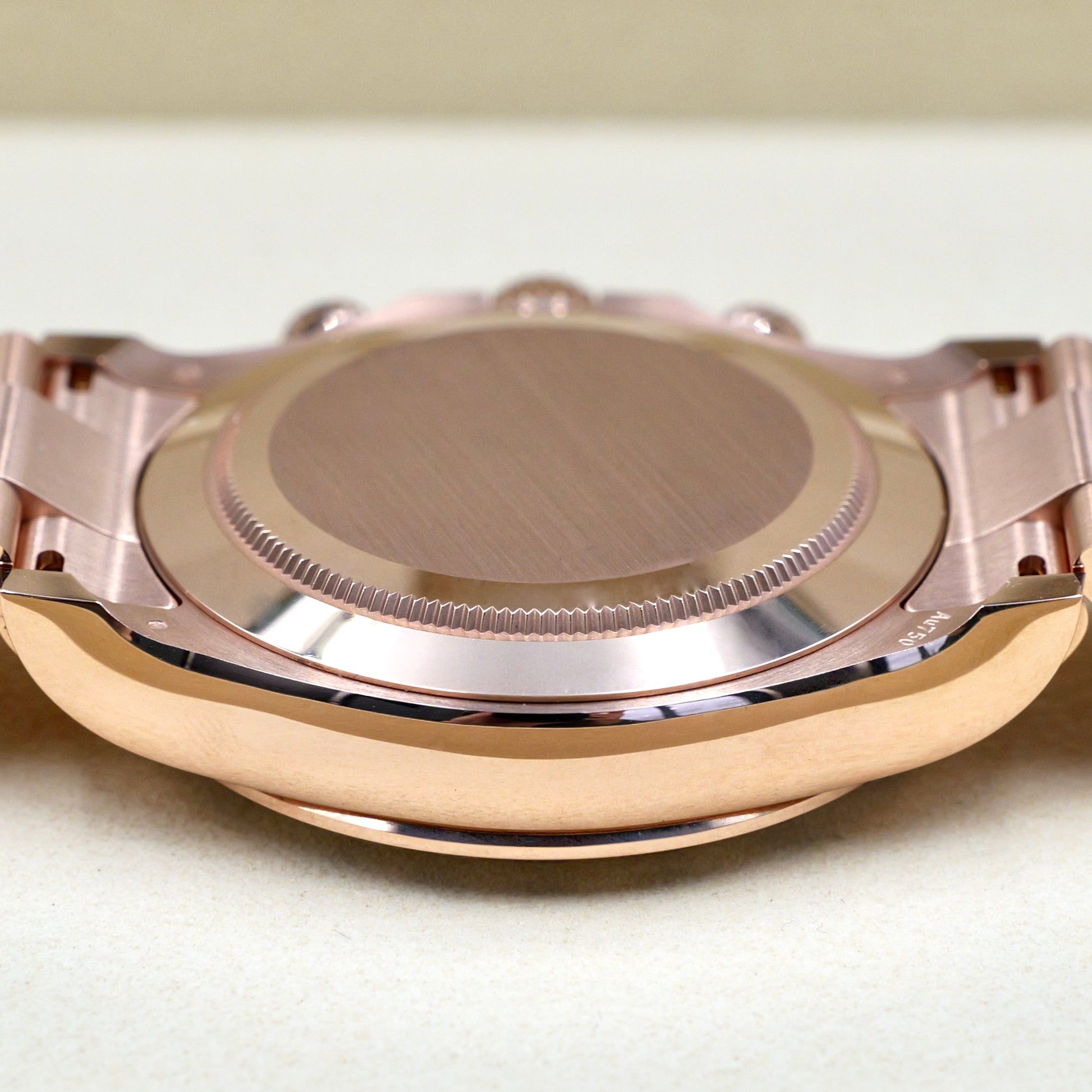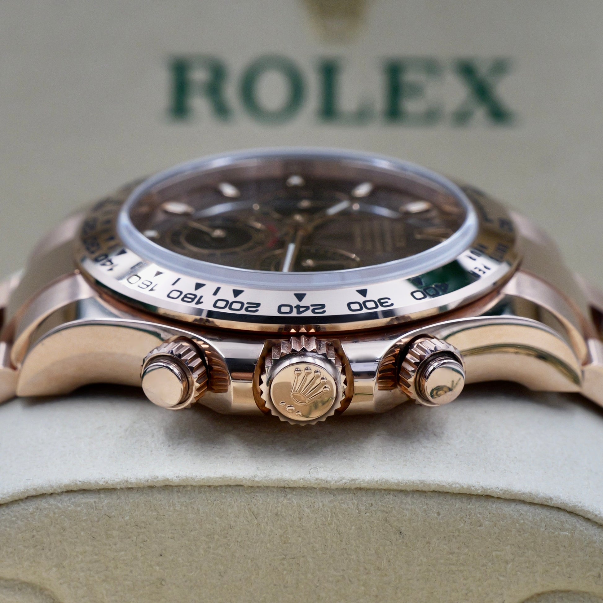 The 40mm Oyster case, crafted from Rolex’s proprietary Everose gold, radiates warmth and exclusivity. This watch has a solid 18k bezel with an engraved tachymeter scale, ensuring both durability and function. Its rich chocolate sunburst dial, accented with black subdials and 18k rose gold baton hour markers, provides exceptional legibility and a striking contrast that enhances its sporty yet elegant aesthetic