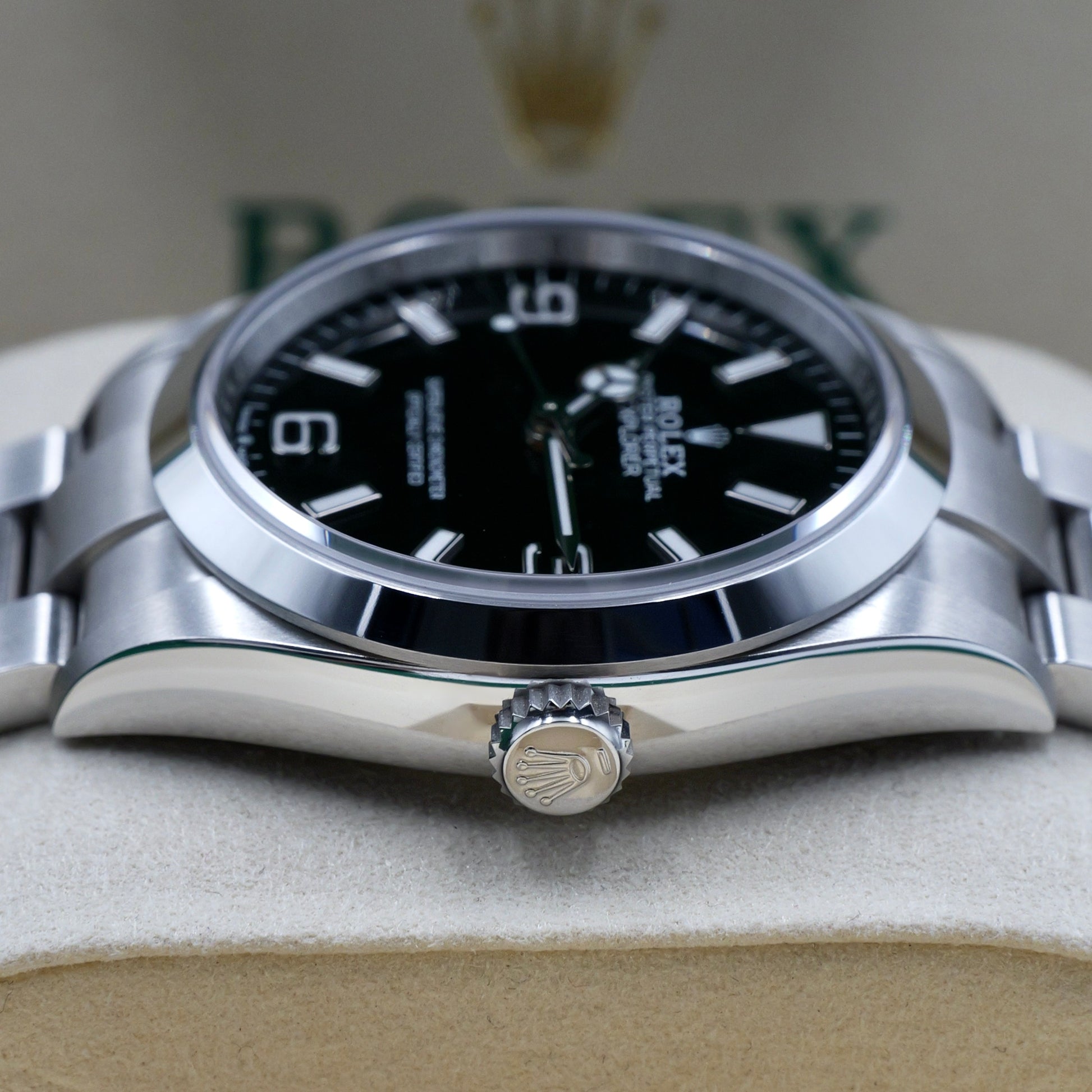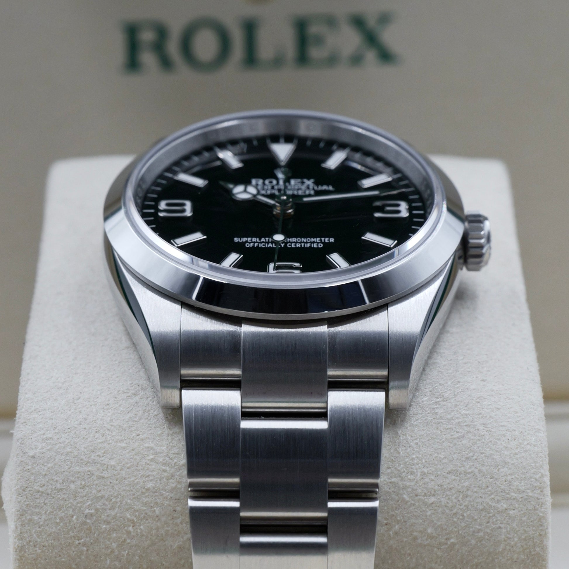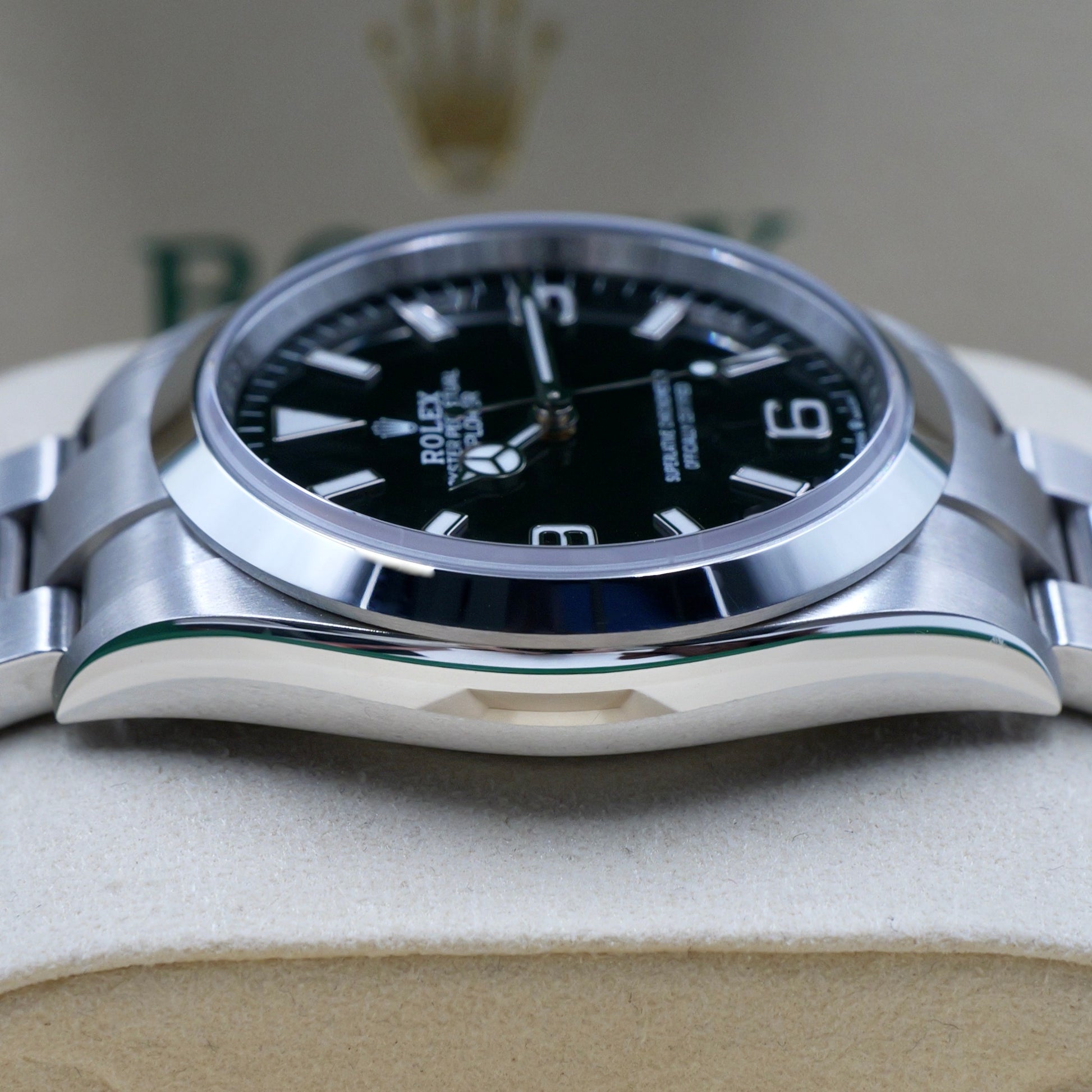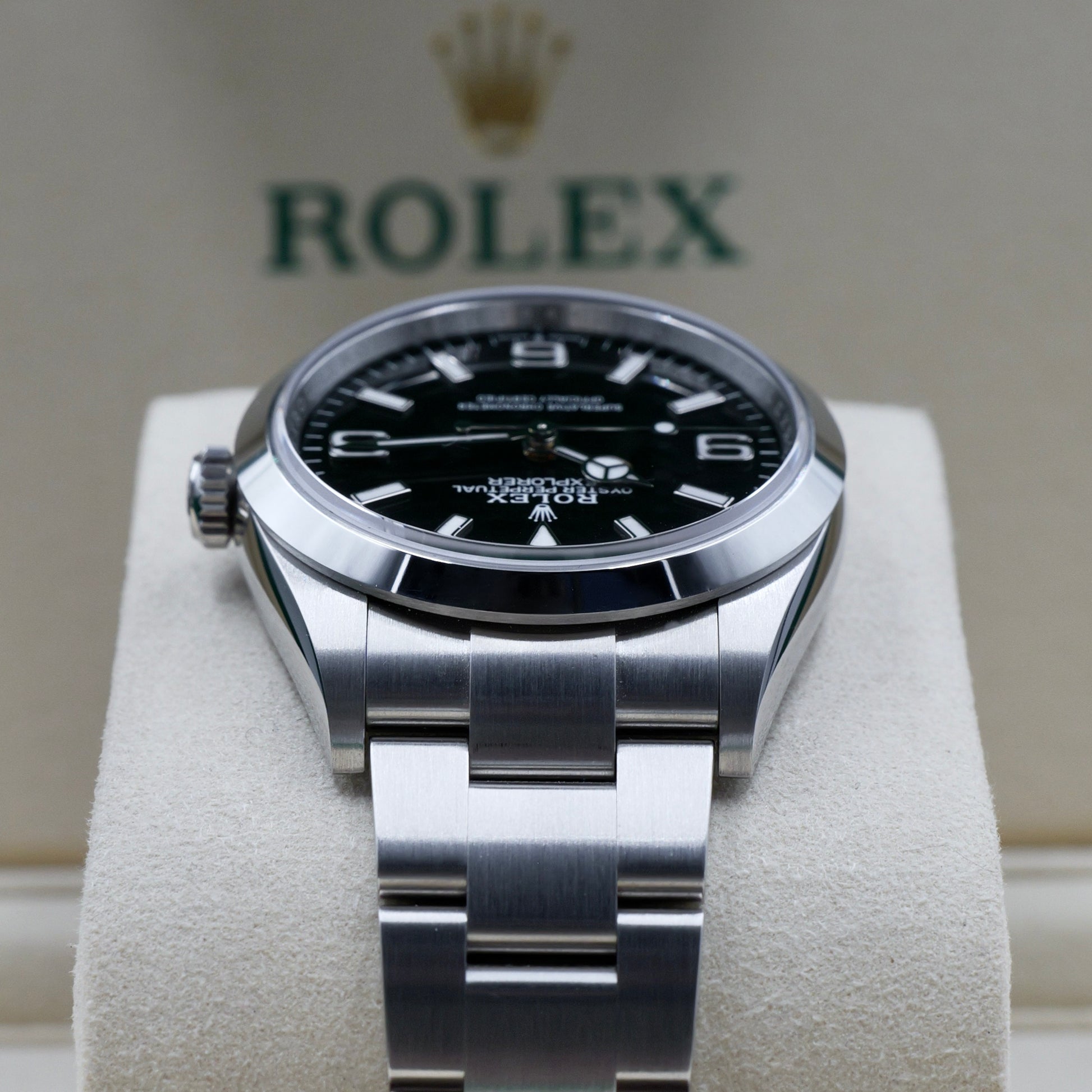 The 36 mm Oyster case delivers exceptional durability and comfort, featuring a blend of polished and brushed finishes that emphasise the Explorer’s understated toughness. The smooth bezel frames the classic black lacquer dial, clean, legible, and timeless.