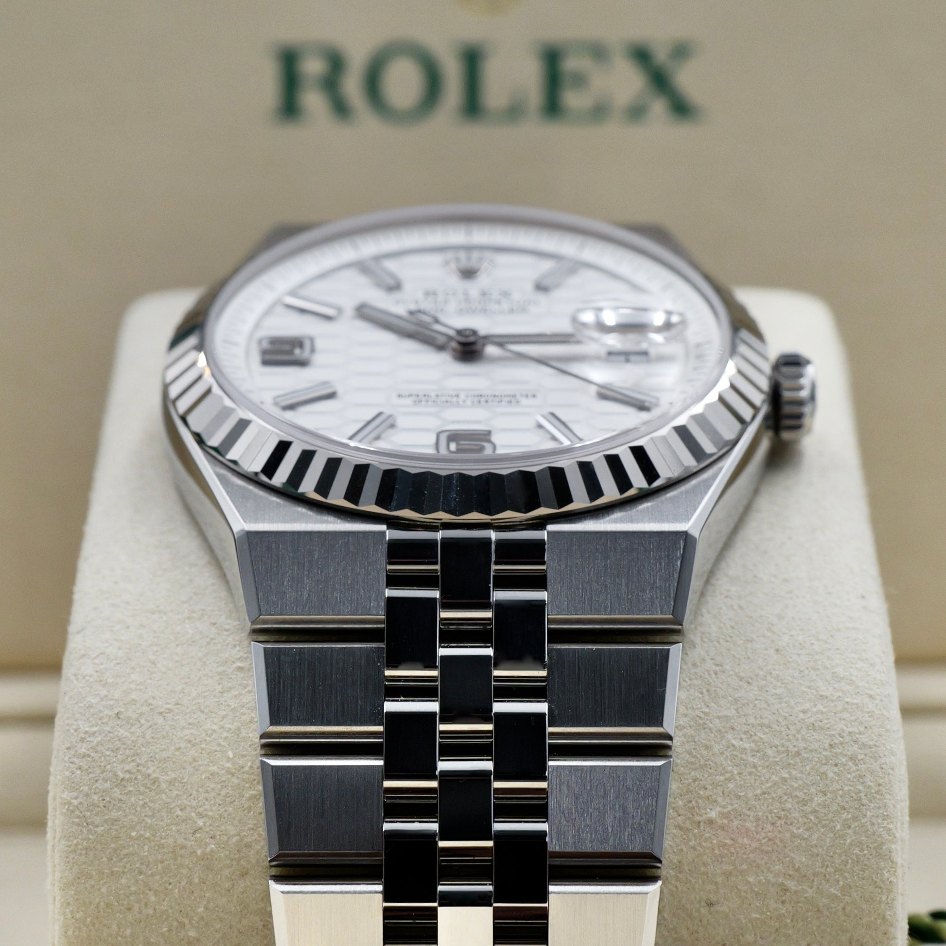 The Rolex Datejust 41 reference 127334 combines the enduring DNA of the Datejust collection with contemporary proportions and precision engineering. Crafted from a harmonious blend of Oystersteel and 18 ct white gold, this configuration with its clean white dial and fluted bezel embodies the perfect balance of sophistication and versatility.
