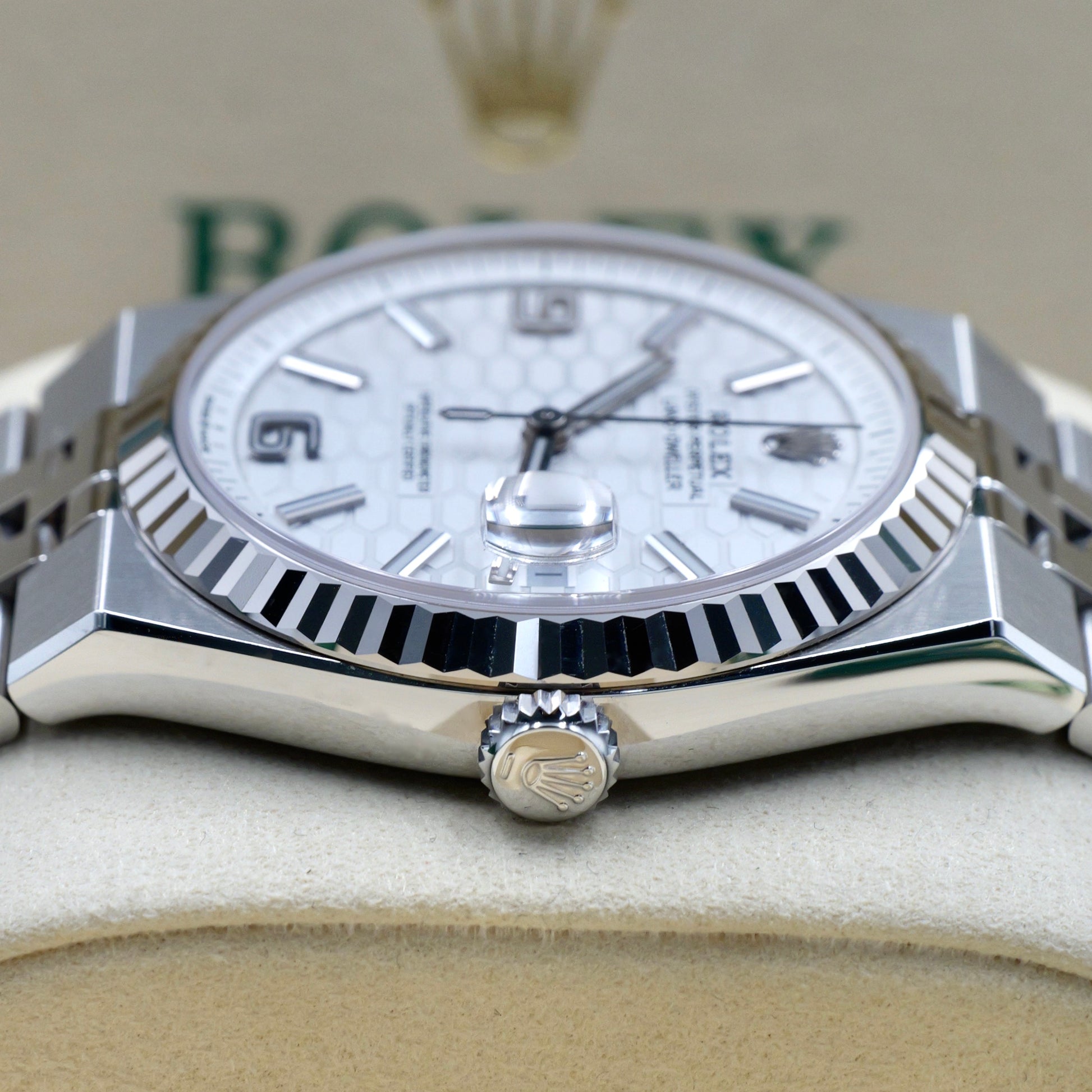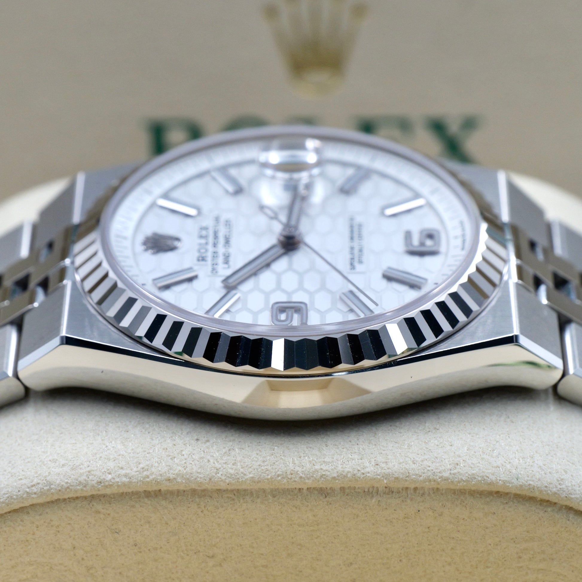 The 41 mm Oyster case, known for its sleek profile and waterproof robustness, is crowned by the iconic 18 ct white gold fluted bezel instantly recognizable and designed to catch light from every angle. The crisp white dial offers pure minimalism, enhanced by polished white-gold baton hour markers and luminous hands for impeccable legibility. At 3 o’clock, the date display magnified by the Cyclops lens adds both practicality and symmetry to the design.