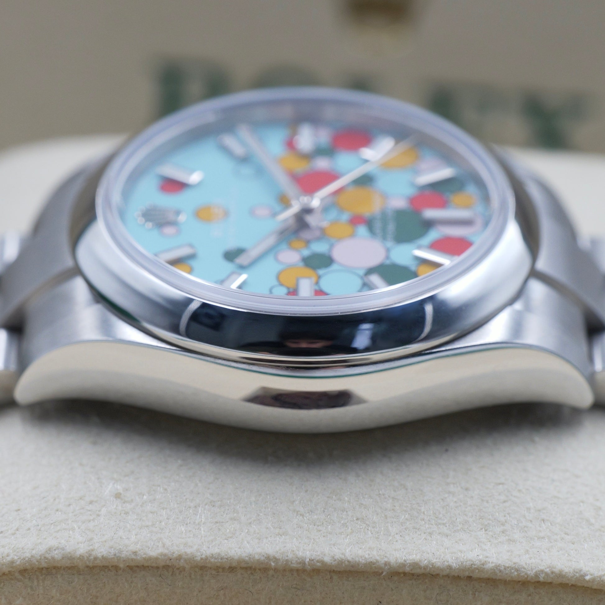 The 31 mm Oyster case, known for its balanced proportions and polished surfaces, is topped with a smooth bezel that reflects light with refined simplicity. The standout feature the Celebration dial combines a turquoise lacquer base with a mosaic of pink, yellow, coral, red, and green “bubble” motifs, creating a lively yet sophisticated visual composition.