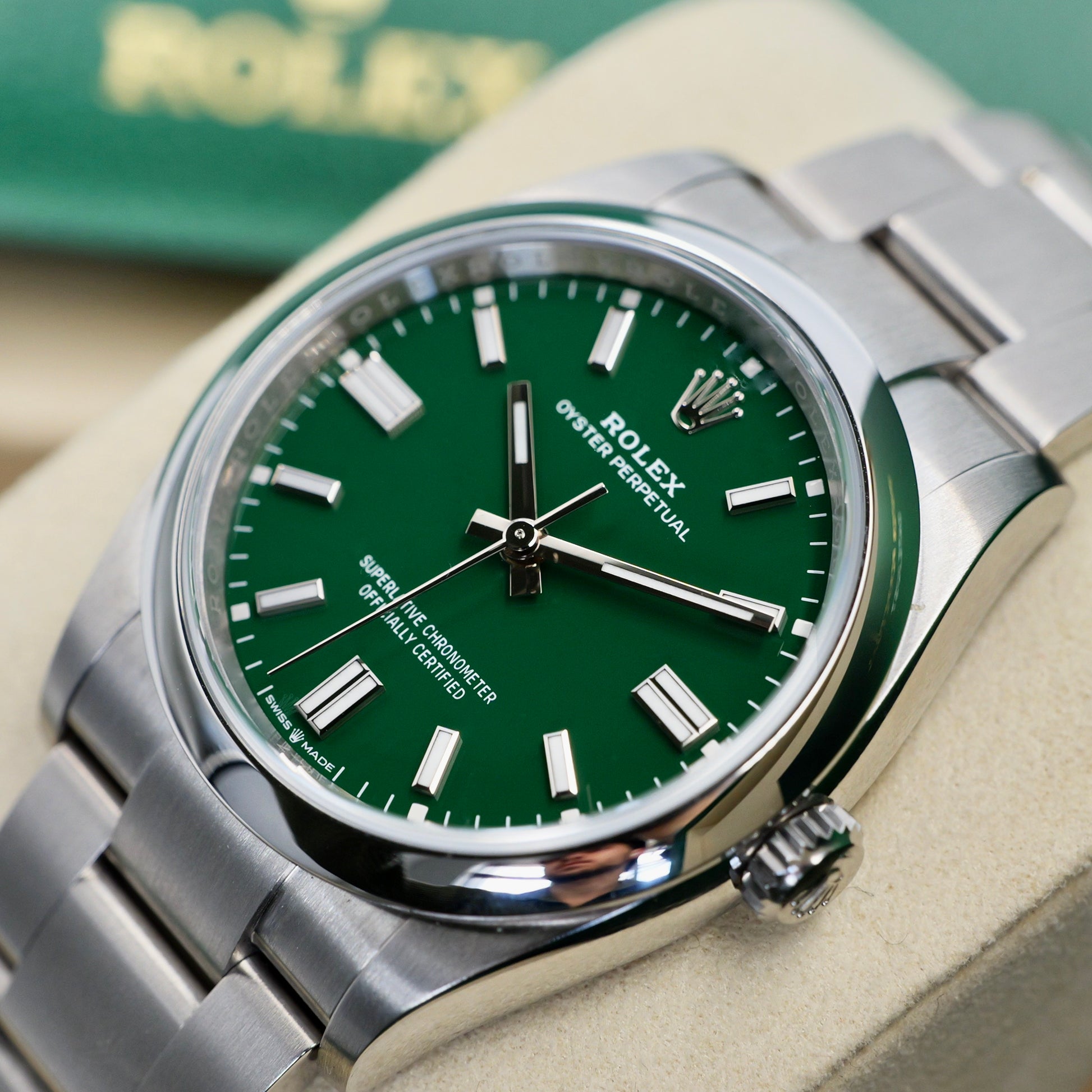 The Rolex Oyster Perpetual 36 126000 in Oystersteel, featuring the vibrant green lacquered dial, offers a modern, minimalist take on the brand’s most pure design expression. Its 36mm Oyster case, polished to perfection, embodies everyday versatility with unmistakable Rolex quality.