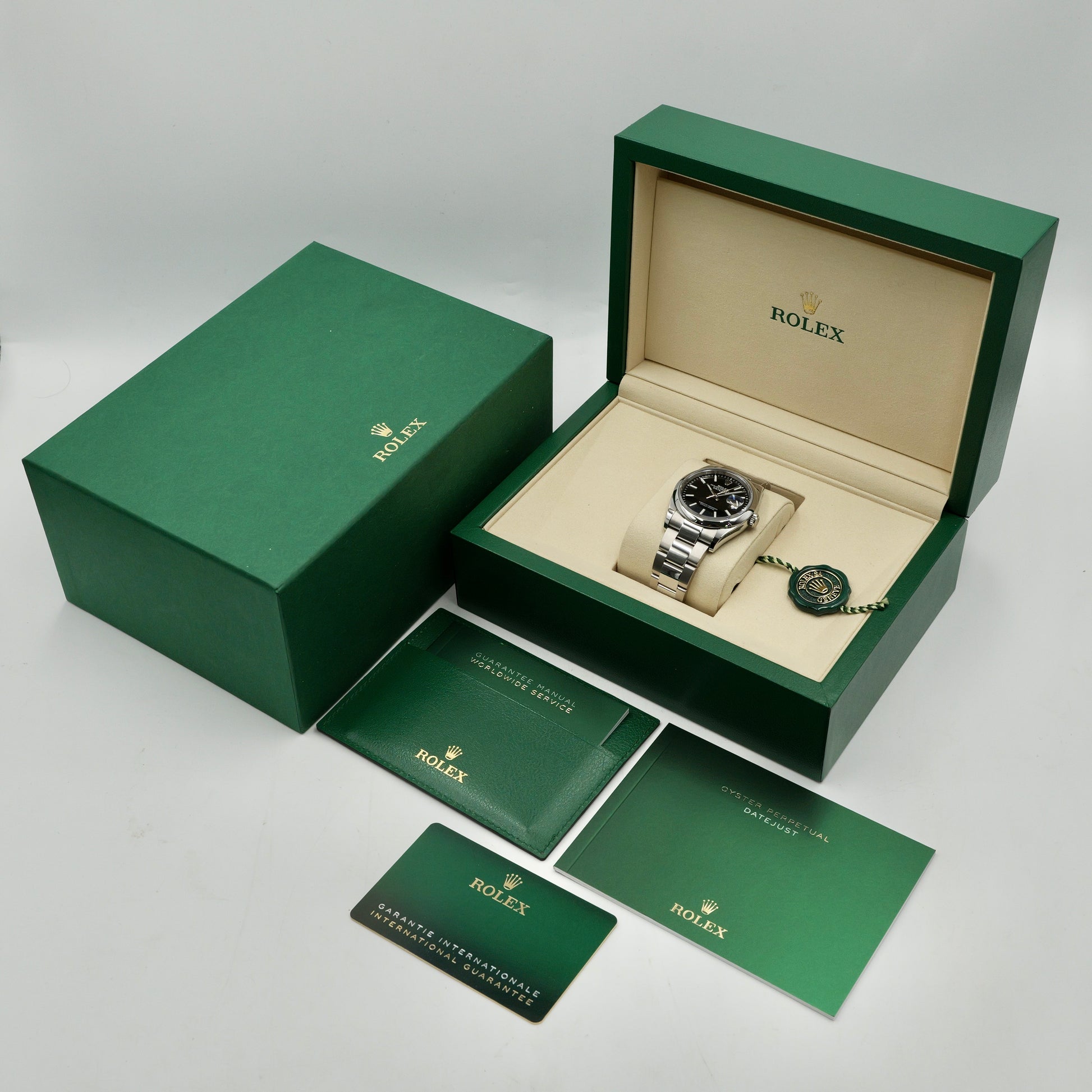 The vibrant green dial, enhanced by a sunburst finish, radiates depth and sophistication, while luminous white gold hour markers ensure impeccable readability. Paired with the iconic Oyster bracelet, this timepiece is the perfect fusion of minimalist design and Rolex’s signature precision—a true modern classic.