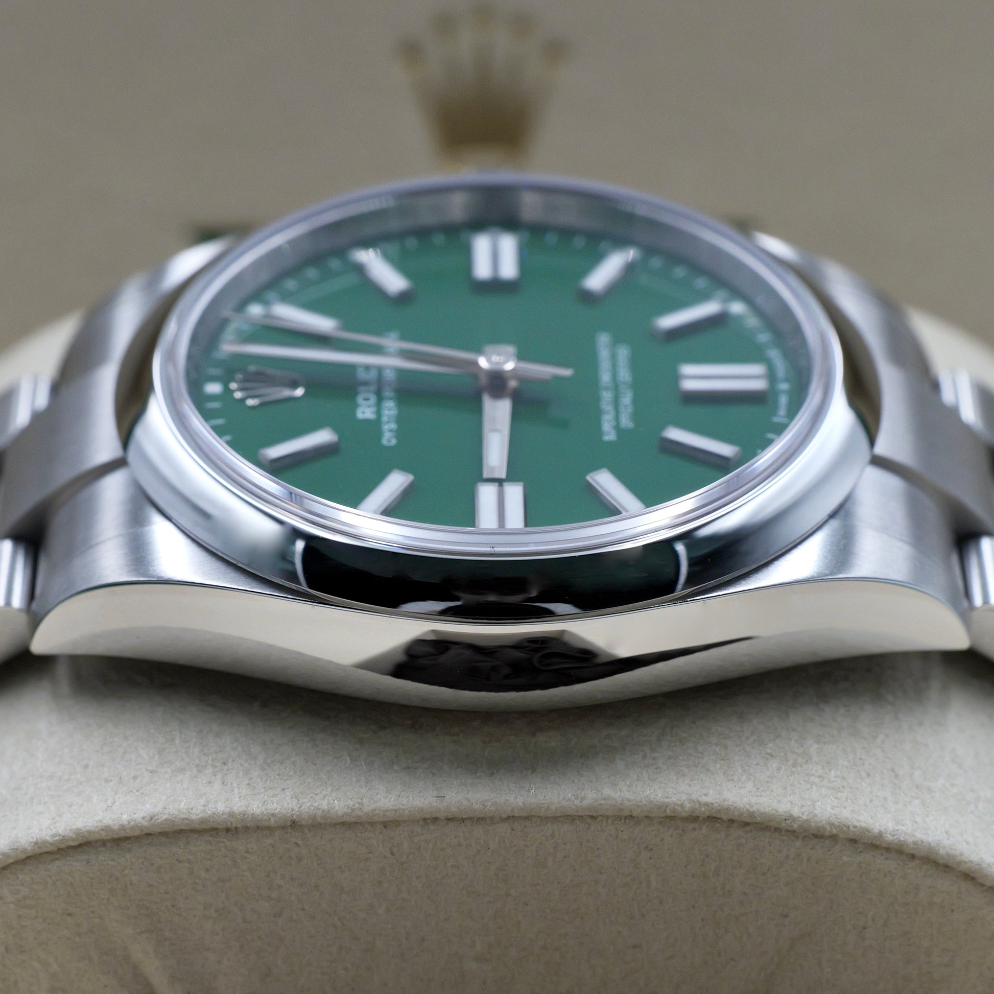 The Rolex Oyster Perpetual 41 with a green dial captures the essence of timeless elegance with a contemporary twist. Its 41mm Oystersteel case, paired with a smooth bezel, offers a sleek and versatile silhouette, perfect for everyday wear.