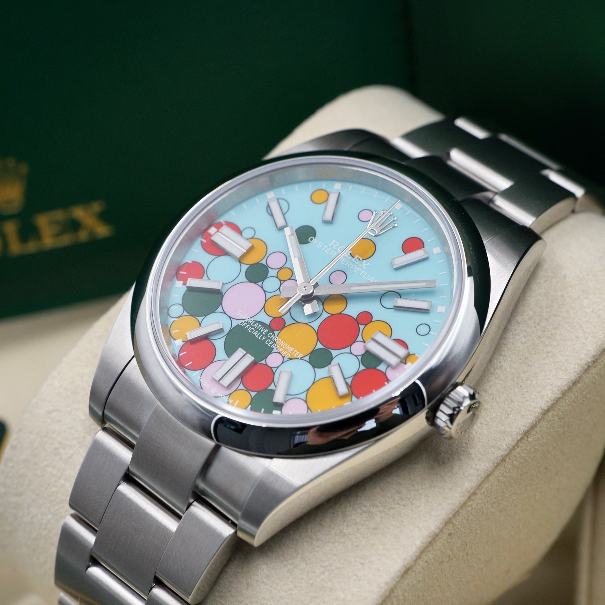 The 41 mm Oyster case, polished to perfection, is paired with a smooth domed bezel for a clean, contemporary silhouette. Its standout feature the Celebration dial, draws inspiration from the vibrant lacquer colours of the Oyster Perpetual collection, combining turquoise blue with a joyful pattern of pink, coral, green, red, and yellow “bubbles.” Each dial is unique, radiating individuality while retaining the minimalist purity that defines the Oyster Perpetual line.