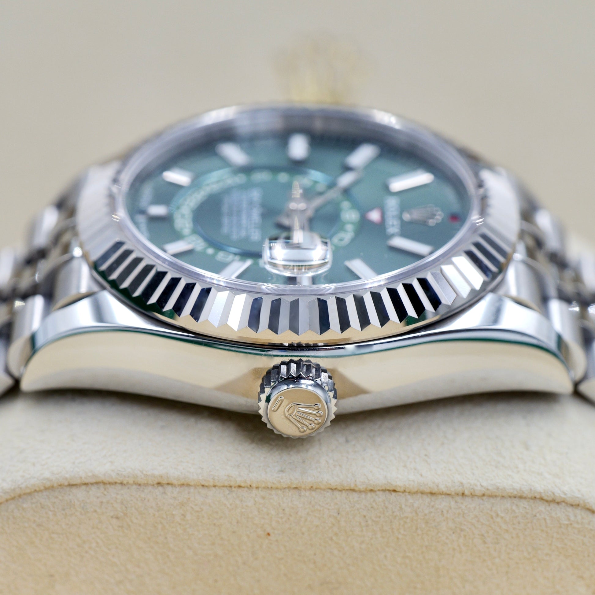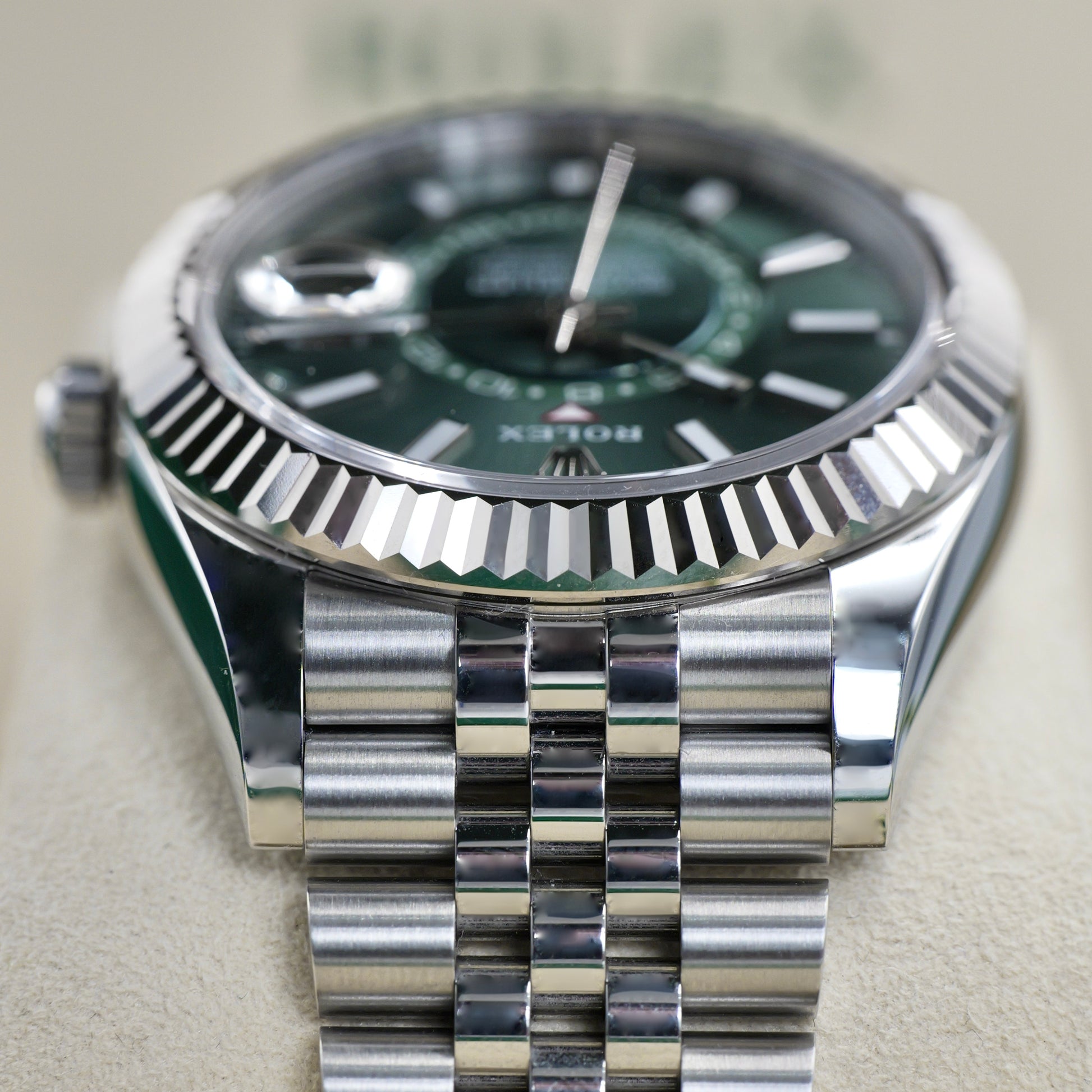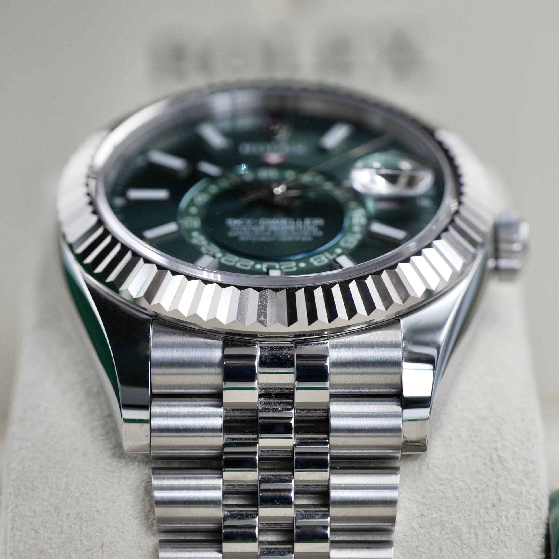 The Rolex Sky-Dweller 336934 with green dial elevates one of Rolex’s most technically advanced timepieces with a fresh, vivid aesthetic. Crafted in Oystersteel and 18k white gold, its 42mm case is framed by the fluted Ring Command bezel, an innovative component that seamlessly controls the watch’s dual time zone and annual calendar functions.