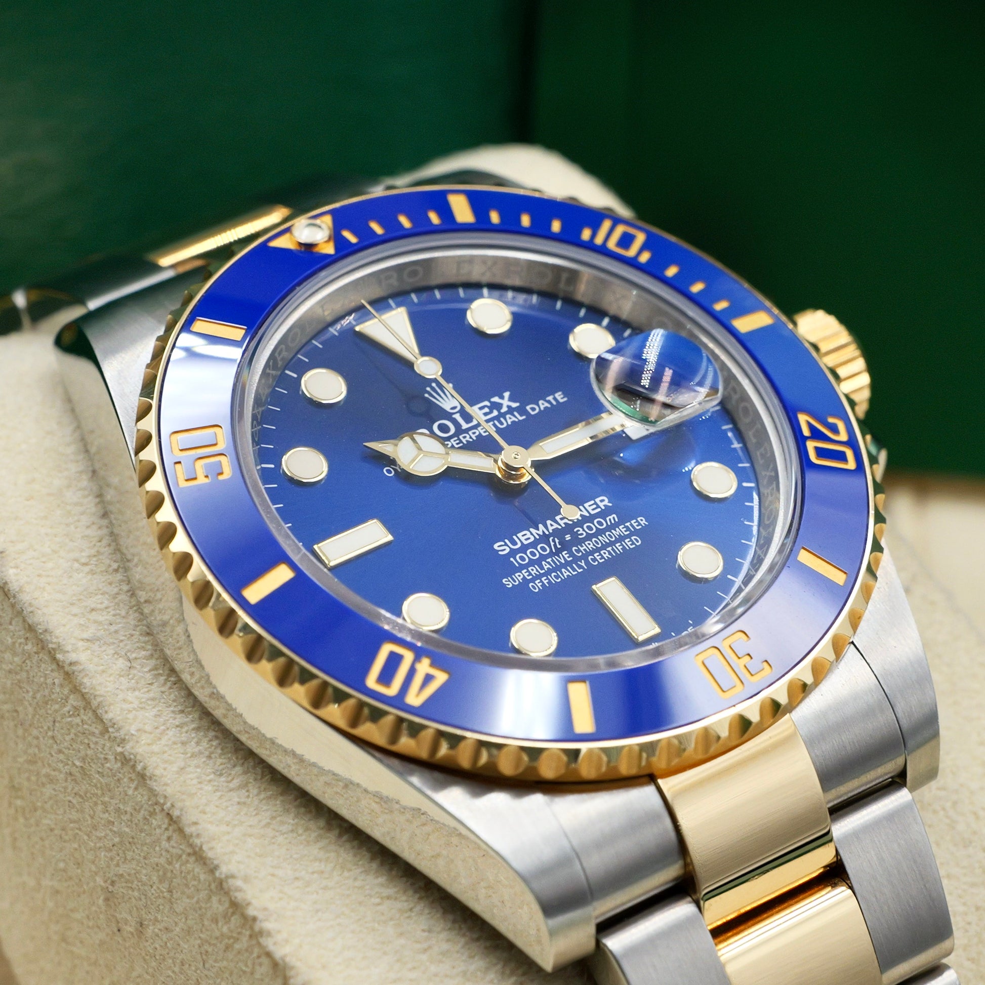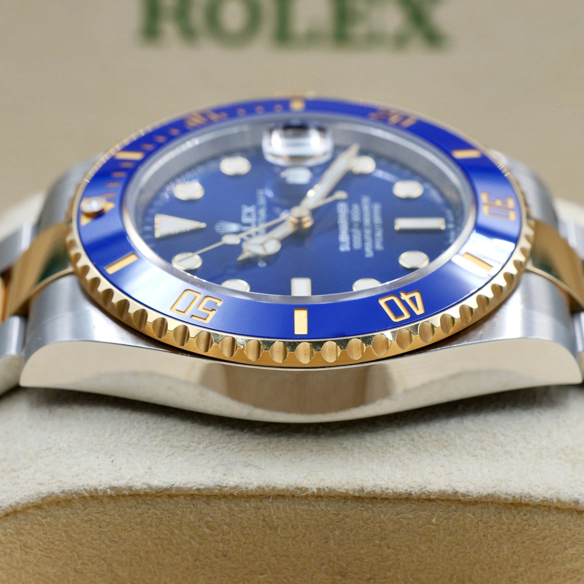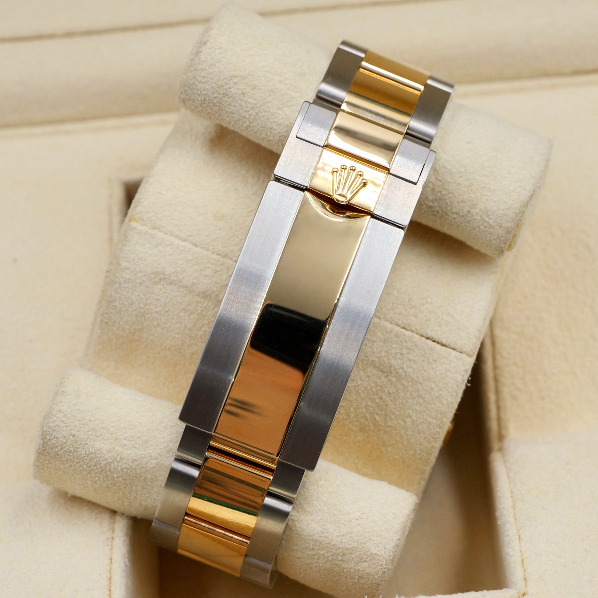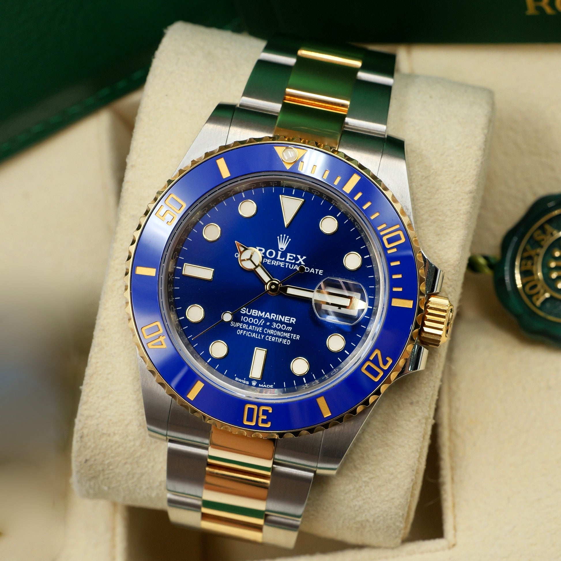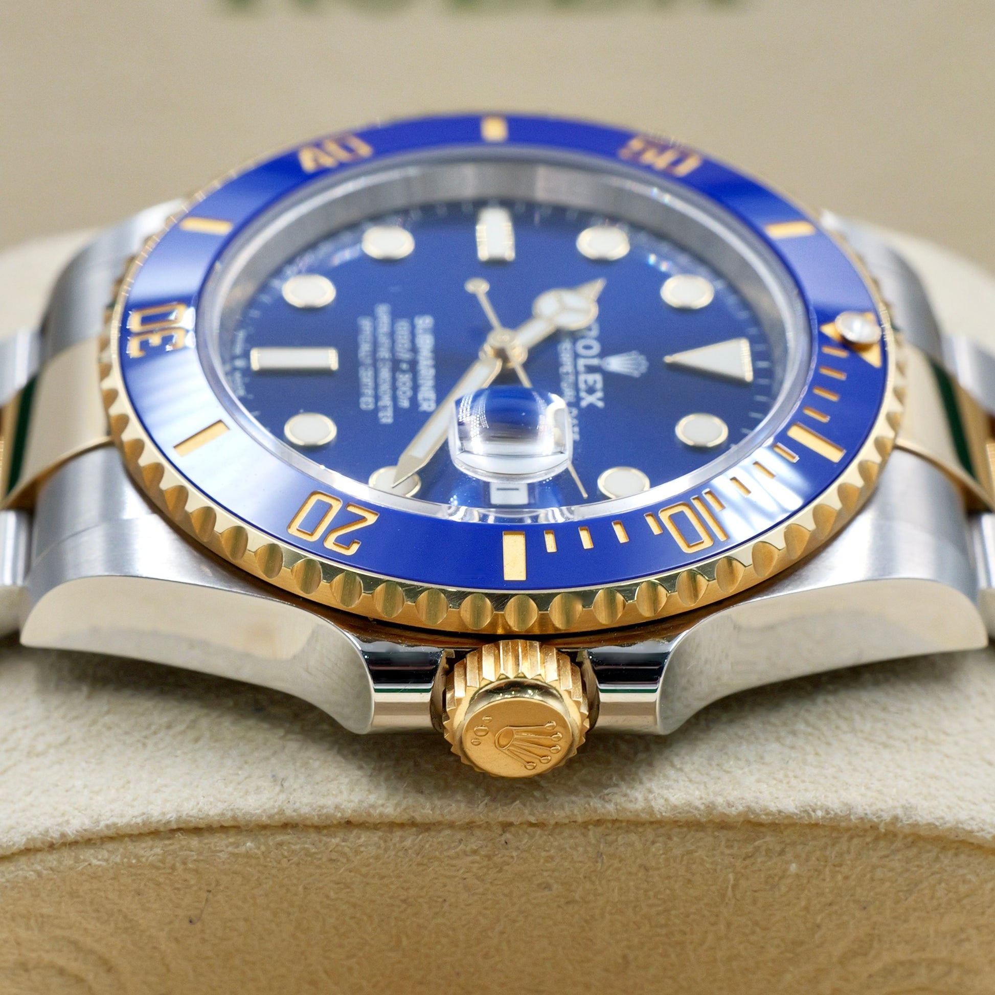 The sunburst blue dial, adorned with gold hour markers and Chromalight luminescence, ensures exceptional readability, even in the darkest depths. Paired with the two-tone Oyster bracelet, this Submariner Date is the perfect fusion of dive watch functionality and timeless sophistication—a true symbol of Rolex excellence.