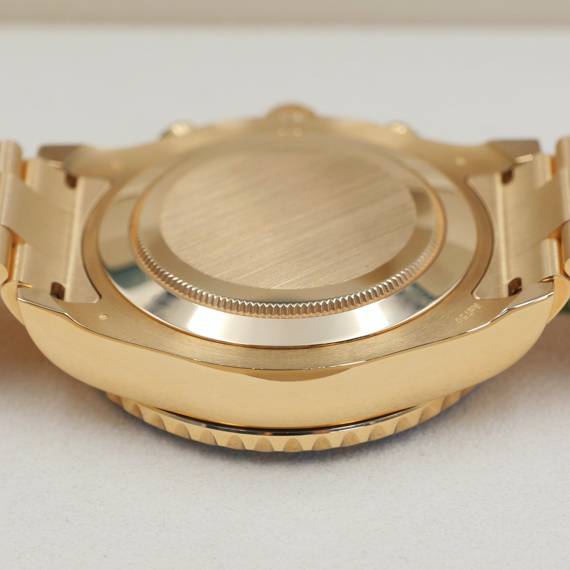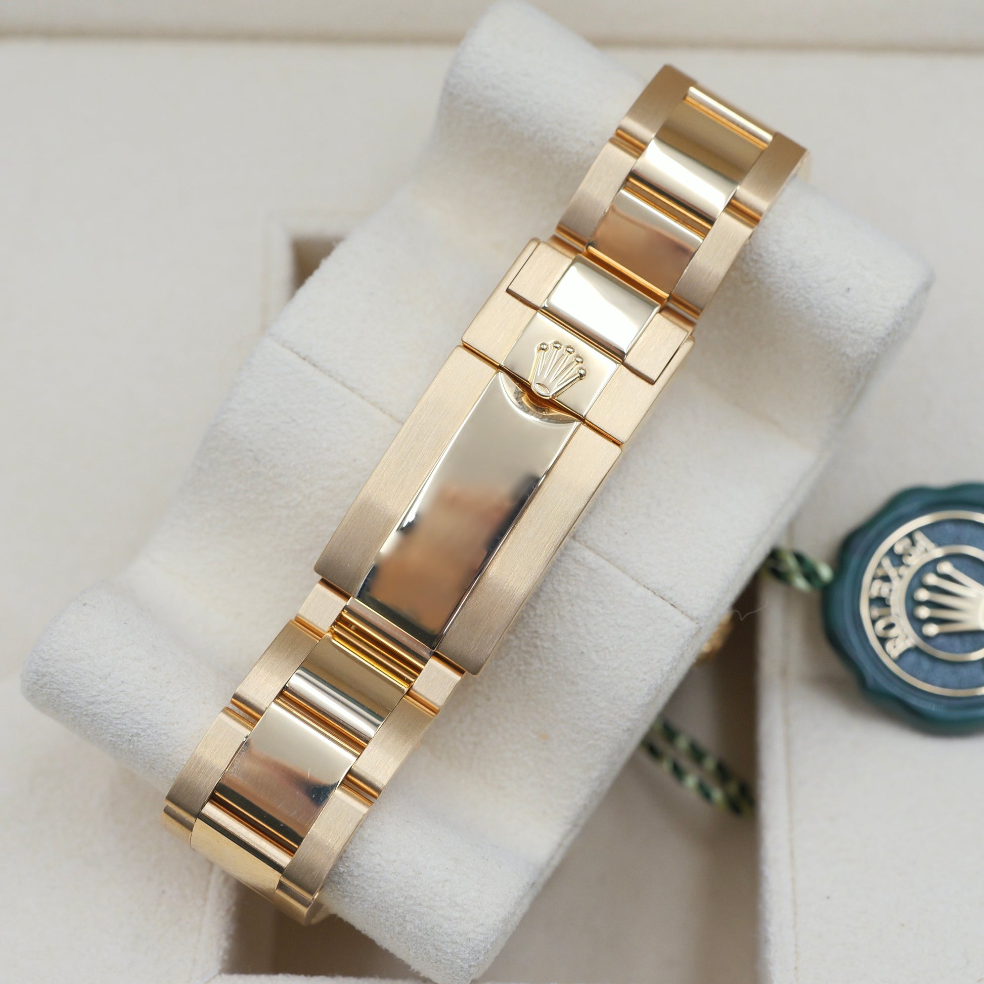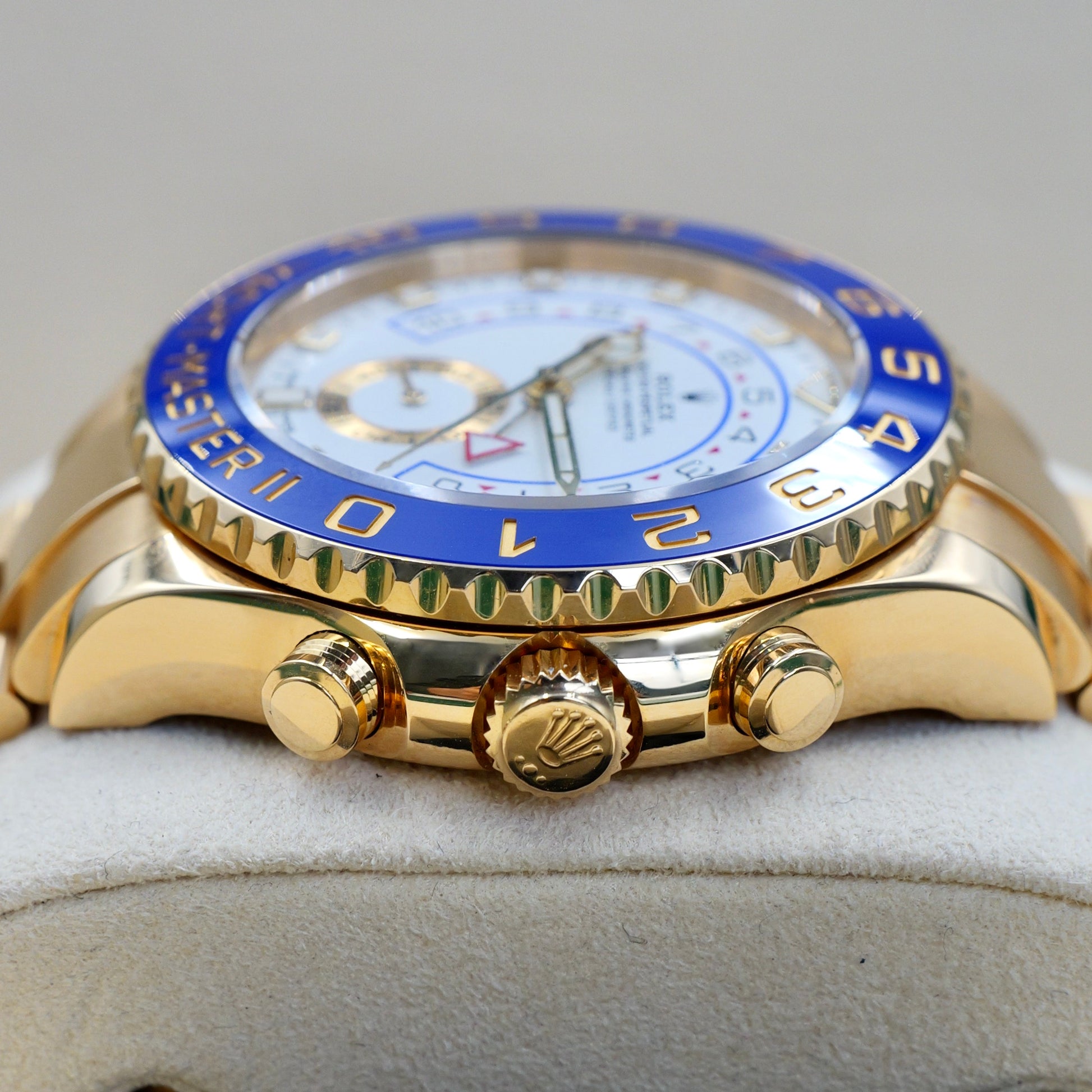 The 44 mm Oyster case in gleaming yellow gold delivers exceptional wrist presence while maintaining the robust durability expected of a Rolex professional model. Its defining feature, the blue Cerachrom bezel insert, engraved with a 10-minute regatta countdown scale, provides both striking contrast and long-lasting scratch and fade resistance. Polished and satin-finished surfaces play beautifully with the metal’s warm tones.