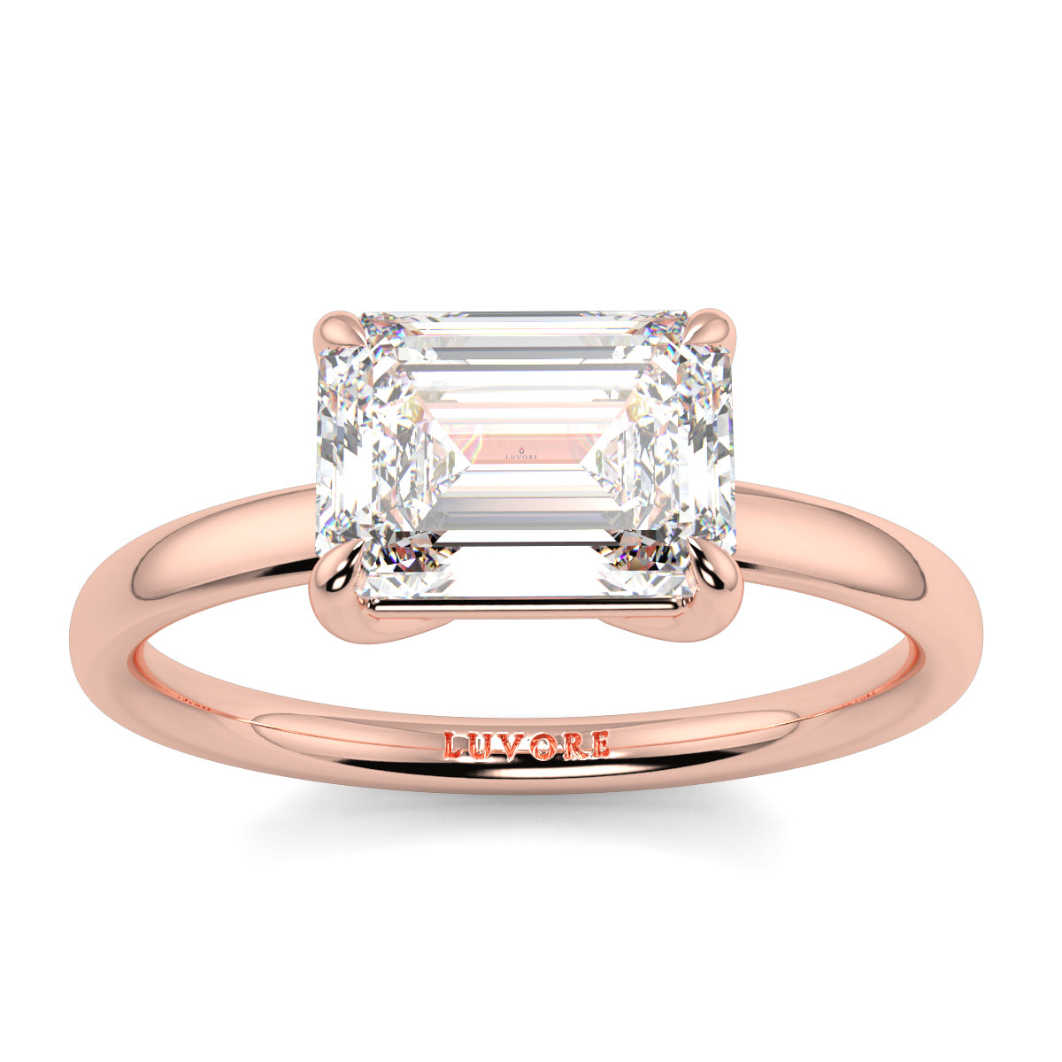 The emerald-cut diamond is oriented on its side in a four-claw setting, creating a horizontal, architectural profile that emphasizes symmetry and light brilliance from every angle.