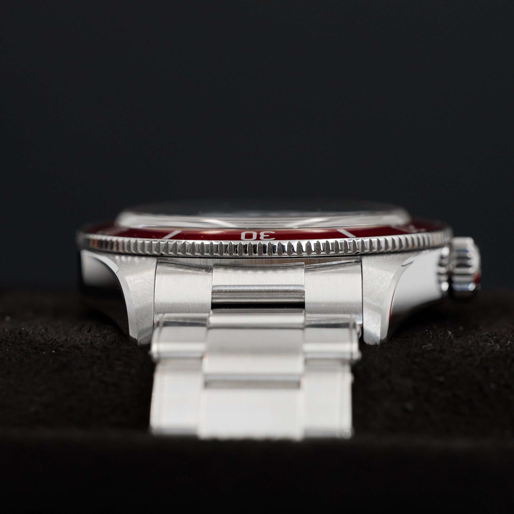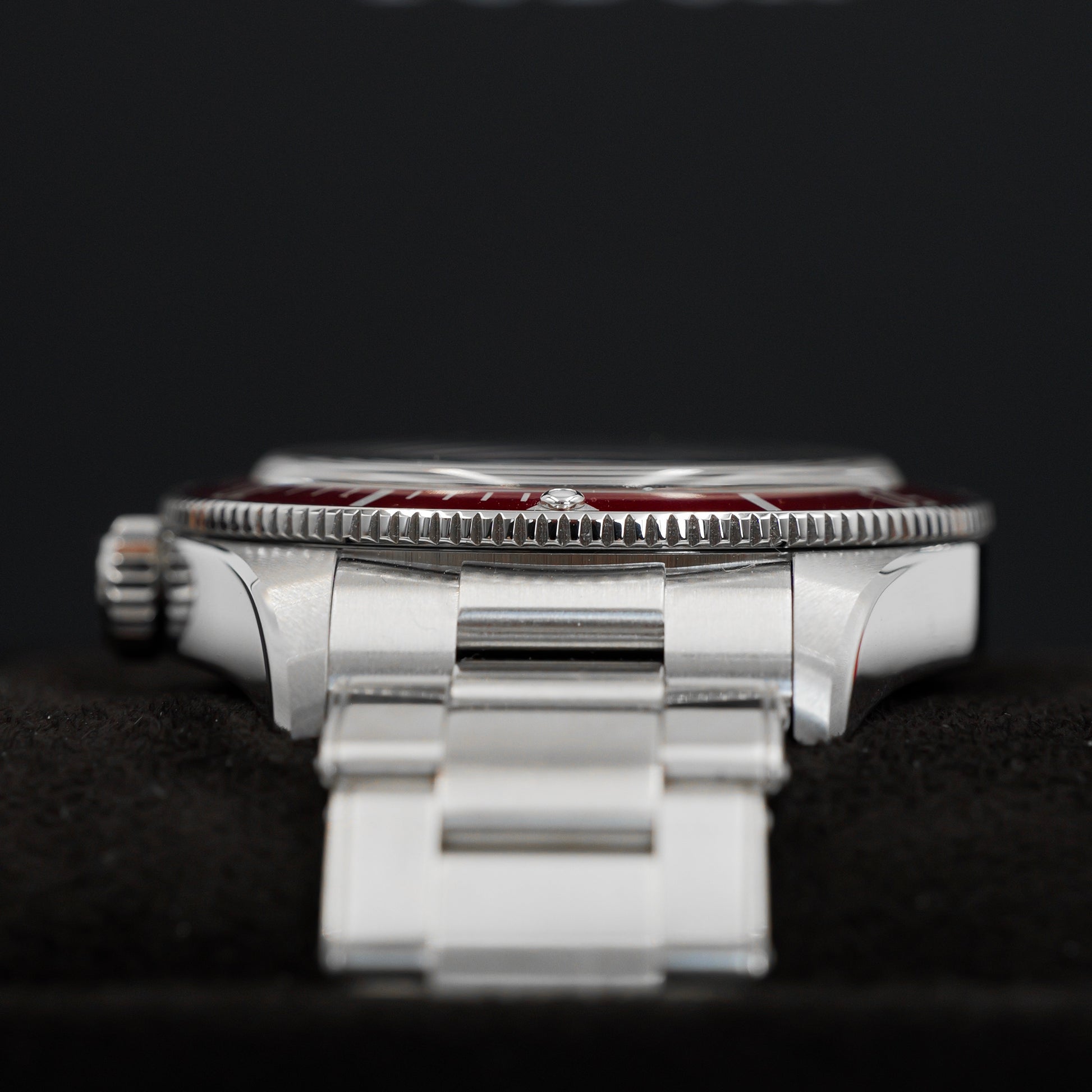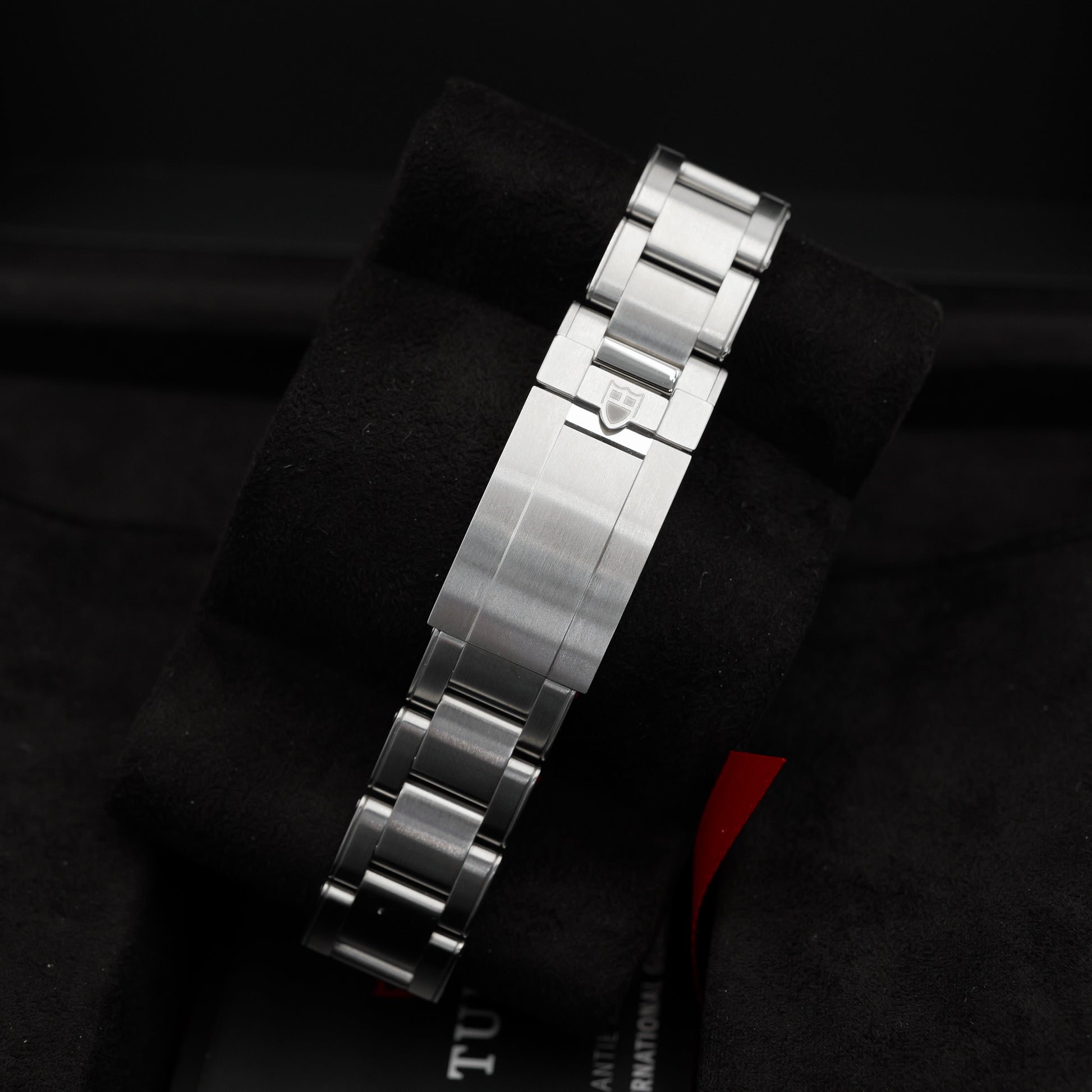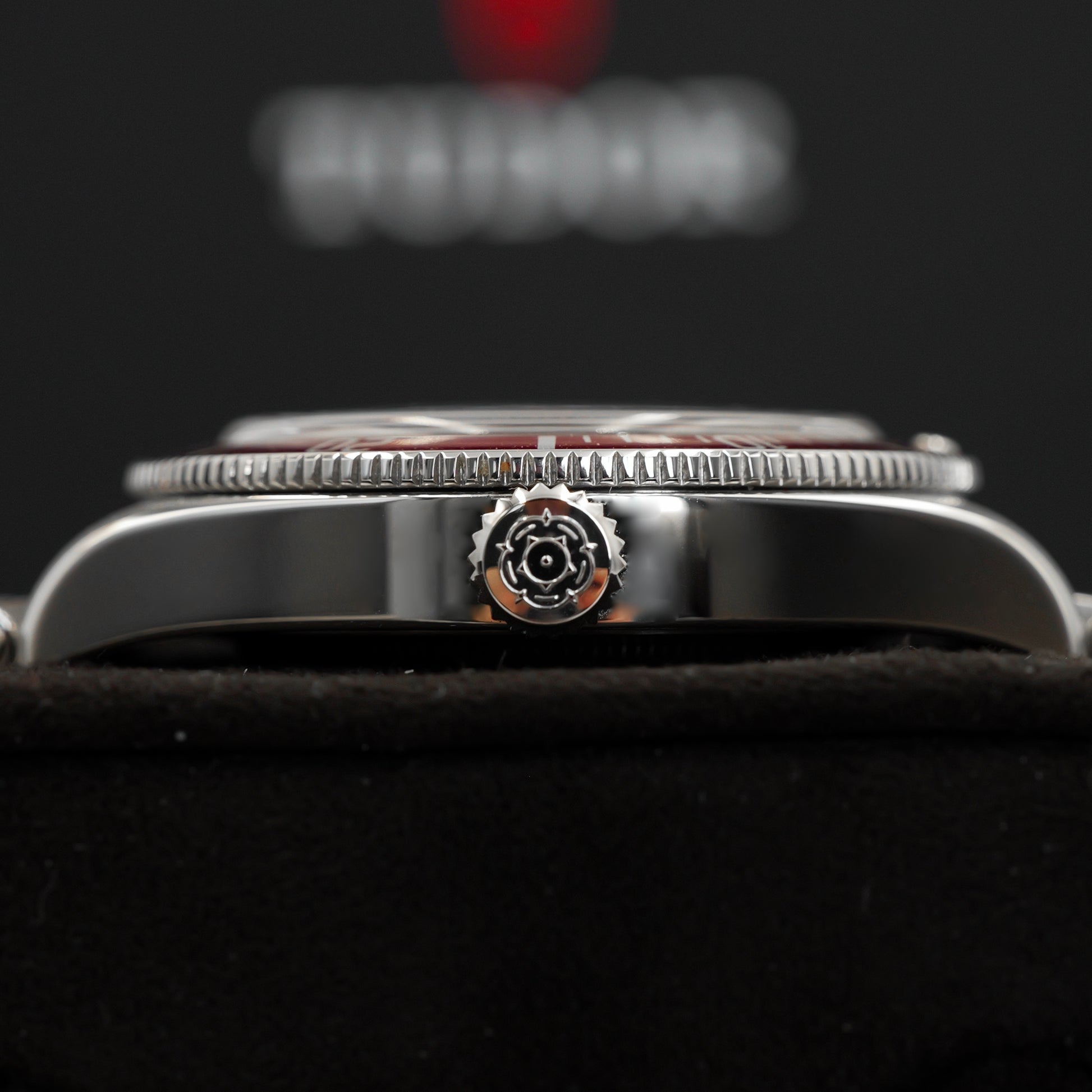 The standout opaline red dial, contrasted by gilt accents and snowflake hands, evokes a nostalgic charm, while the black and burgundy aluminium bezel pays homage to classic dive watch design. Powered by a COSC-certified movement and paired with a comfortable rivet-style steel bracelet, this Black Bay 58 is a versatile companion for adventurers and collectors alike—bold, functional, and undeniably Tudor.
